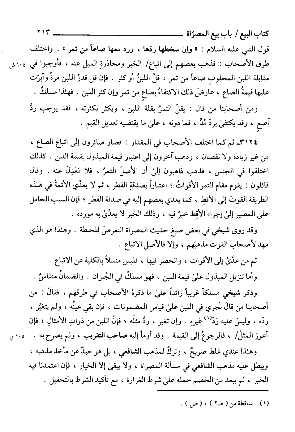 3124 - ثم كما اختلف الأصحاب في المقدار: فصار صائرون إلى اتباع الصاع، من غير زيادة ولا نقصان، وذهب آخرون إلى اعتبار قيمة المبذول بقيمة اللبن. كذلك اختلفوا في الجنس، فذهب ذاهبون إلى أن الأصلَ التمرُ، فلا مَعْدِلَ عنه. وقال قائلون: يقوم مقام التمر الأقواتُ؛ اعتباراً بصدقةِ الفطر، ثم لا يعدِّي الأئمةُ في هذه الطريقة القوتَ إلى الأقطِ، كما يعدي بعضهم إليه في صدقة الفطر؛ فإن السبب الحامل على المصير إلى إجزاء الأقِط خبر فيه، وذلك الخبر لا يعدَّى به مورده.