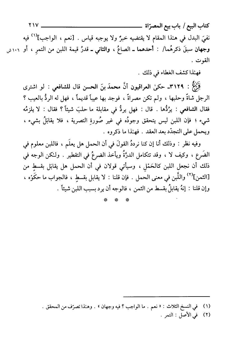 3129 - حكى العراقيون أنَّ محمدَ بنَ الحسن قال للشافعي: لو اشترى الرجل شاةً وحلبها، ولم تكن مصراةً، فوجد بها عيباً قديماً، فهل له الردُّ بالعيب؟