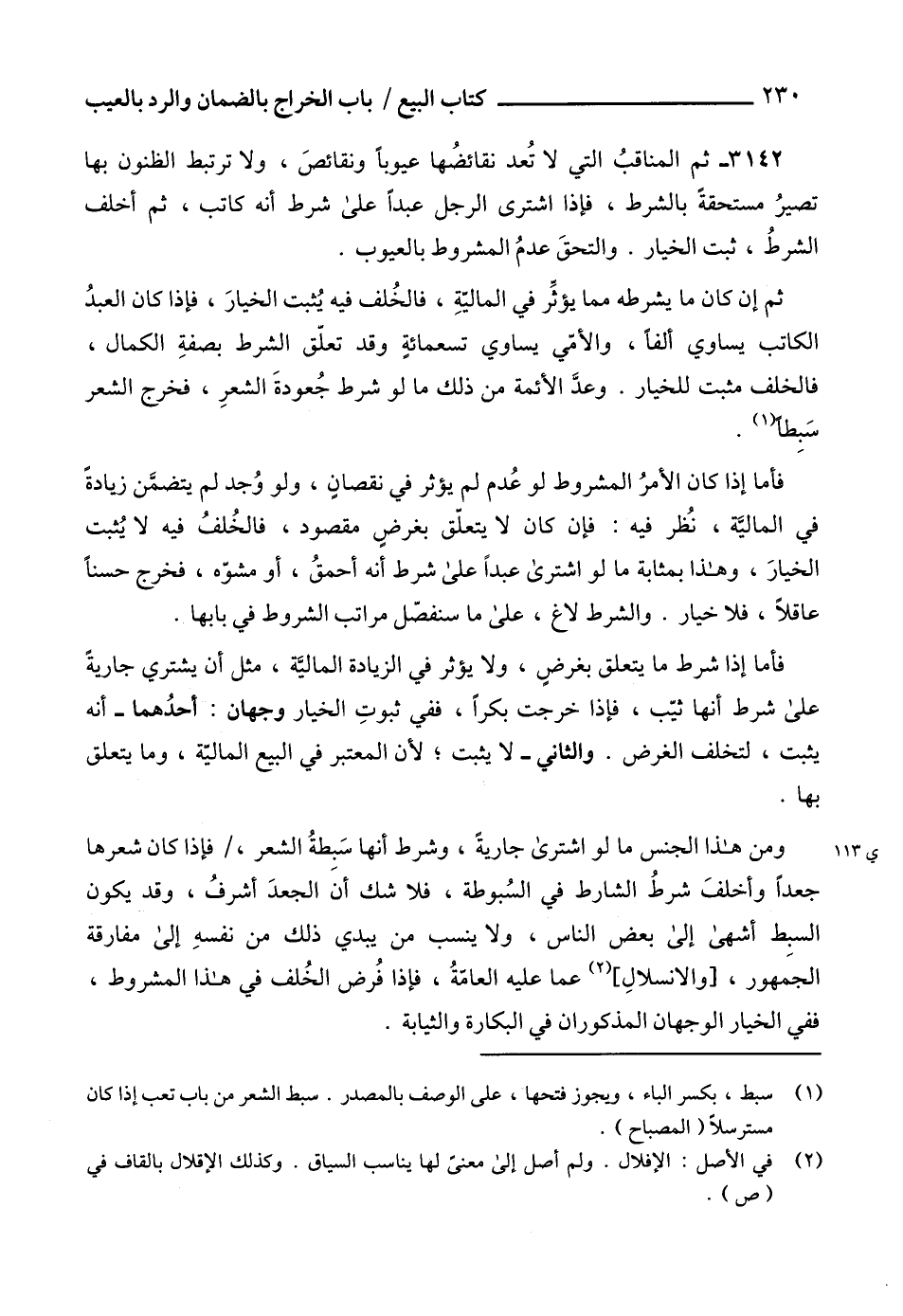 3142 - ثم المناقبُ التي لا تُعد نقائضُها عيوباً ونقائصَ، ولا ترتبط الظنون بها تصيرُ مستحقةً بالشرط، فإذا اشترى الرجل عبداً على شرط أنه كاتب، ثم أخلف الشرطُ، ثبت الخيار. والتحقَ عدمُ المشروط بالعيوب.