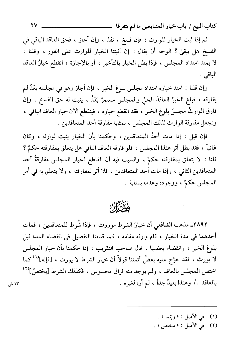2892 - مذهب الشافعي أن خيارَ الشرط موروث، فإذا شُرط للمتعاقدين، فمات أحدهما في مدة الخيار، قام وارثه مقامه، كما قدمنا التفصيل في انقضاء المدة قبل بلوغ الخبر، وانقضاء بعضها. قال صاحب التقريب: إذا حكمنا بأن خيار المجلس لا يورث، فقد خرَّج عليه بعضُ أئمتنا قولاً أن خيار الشرط لا يورث، [فإنه] (1) كما اختص المجلس بالعاقد، ولم يوجد منه فراق محسوس، فكذلك الشرط [يختص] (2) بالعاقد. وهذا بعيدٌ جداً، لم أره لغيره.