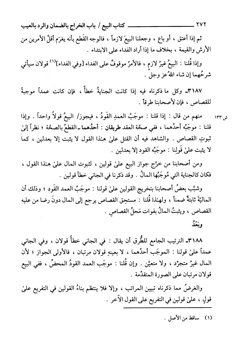 3188 - الترتيب الجامع للطُّرق أن يقال: في الجاني خطأ قولان، وفي الجاني عمداً على قولنا: الموجَب أحدُهما، لا بعينهِ قولان مرتبان، فالأولى الجواز؛ لأن المال غيرُ متجرِّد، ولا متعيَّن. وإن قُلنا: موجَب العمد القودُ المحضُ، ففي البيع قولان مرتبان على الصورة المتقدِّمة.