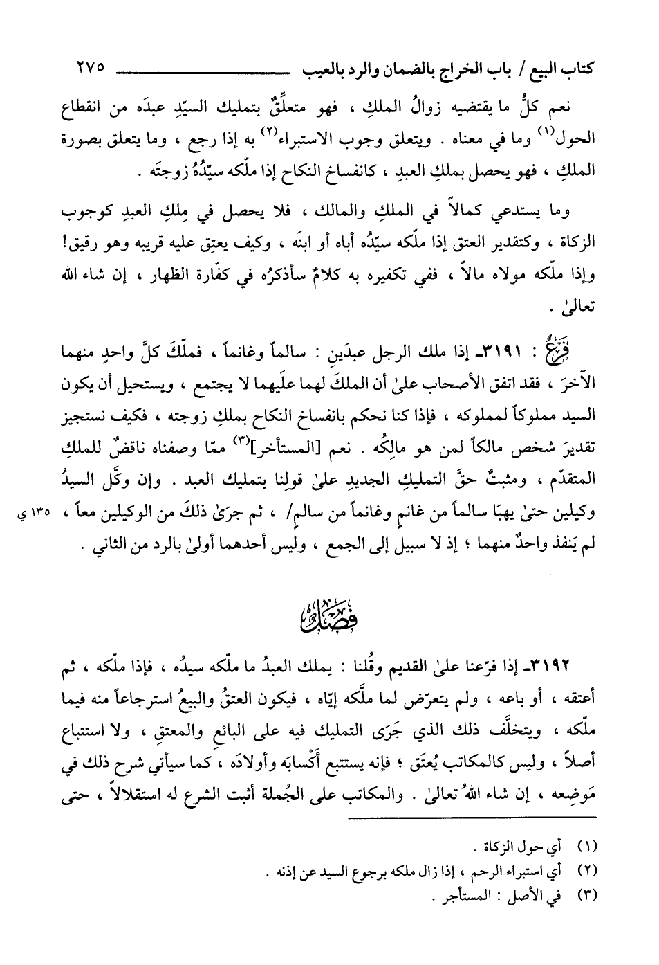 3192 - إذا فرّعنا على القديم وقُلنا: يملك العبدُ ما ملّكه سيدُه، فإذا ملّكه، ثم أعتقه، أو باعه، ولم يتعرّض لما ملَّكه إئاه، فيكون العتقُ والبيعُ استرجاعاً منه فيما ملّكه، ويتخلَّف ذلك الذي جَرَى التمليك فيه على البائعِ والمعتقِ، ولا استتباع أصلاً، وليس كالمكاتب يُعتَق؛ فإنه يستتبع أَكْسابَه وأولادَه، كما سيأتي شرح ذلك في مَوضِعه، إن شاء اللهُ تعالى. والمكاتب على الجُملة أثبت الشرع له استقلالاً، حتى