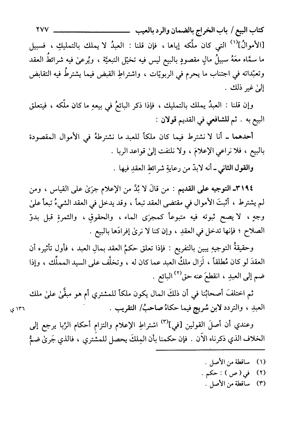 3194 - التوجيه على القديم: من قالَ لا بُدَّ من الإعلام جرَى على القياس، ومن لم يشترط، أثبتَ الأموال في مقتضى العقد تبعاً، وقد يدخل في العقد الشيءُ تبعاً على وجهٍ، لا يصح ثبوته فيه متبوعاً كمجرَى الماء، والحقوقِ، والثمرةِ قبل بدوّ الصلاح؛ فإنها تدخل في العقدِ، وإن كنا لا نرى إفرادَها بالبيع.