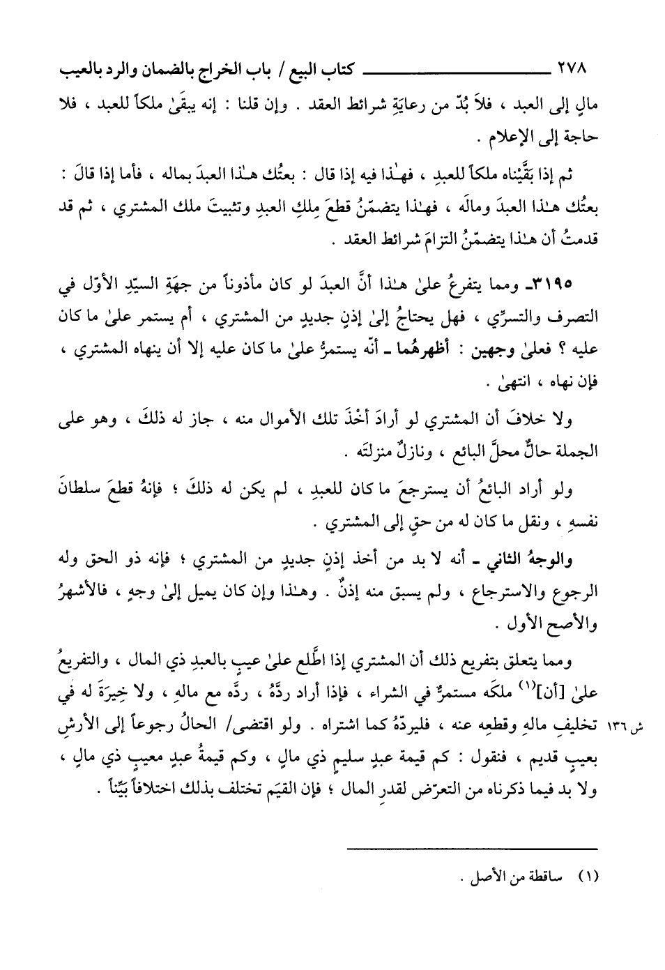 3195 - ومما يتفرعُ على هذا أنَّ العبدَ لو كان مأذوناً من جهَةِ السيّدِ الأوّل في التصرف والتسرِّي، فهل يحتاجُ إلى إذنٍ جديدٍ من المشتري، أم يستمر على ما كان عليه؟ فعلى وجهين: أظهرهُما - أنّه يستمرُّ على ما كان عليه إلا أن ينهاه المشتري، فإن نهاه، انتهى.
