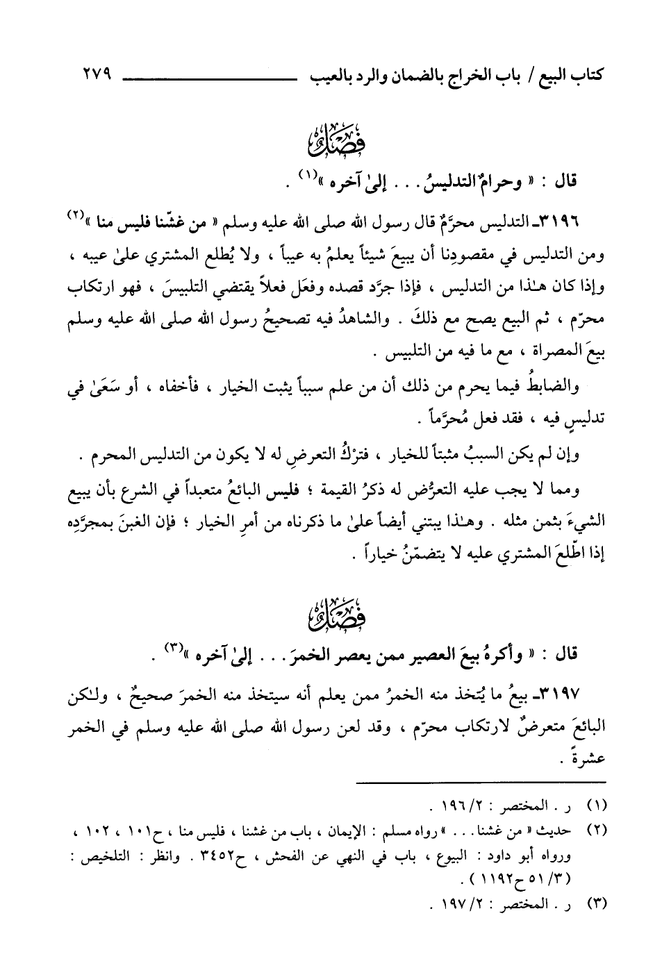 3196 - التدليس محرَّمٌ قال رسول الله صلى الله عليه وسلم " من كشنا فليس منا " (2) ومن التدليس في مقصودِنا أن يبيعَ شيئاً يعلمُ به عيباً، ولا يُطلع المشتري على عيبه، وإذا كان هذا من التدليس، فإذا جرَّد قصده وفعَل فعلاً يقتضي التلبيسَ، فهو ارتكاب محرّم، ثم البيع يصح مع ذلكَ. والشاهدُ فيه تصحيحُ رسول الله صلى الله عليه وسلم بيعَ المصراة، مع ما فيه من التلبيس.