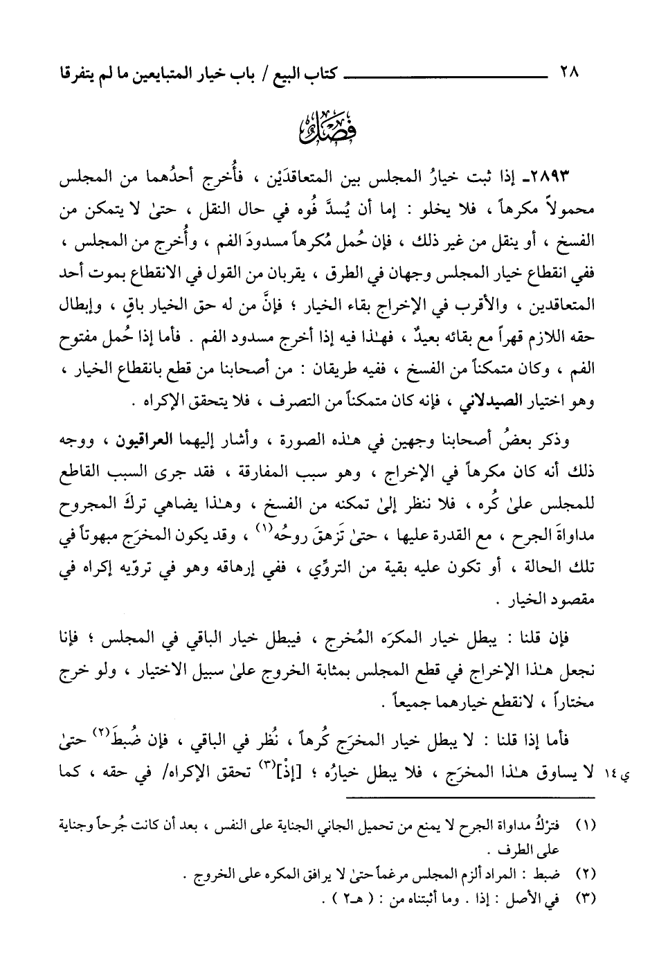 2893 - إذا ثبت خيارُ المجلس بين المتعاقدَيْن، فأُخرج أحدُهما من المجلس محمولاً مكرهاً، فلا يخلو: إما أن يُسدَّ فُوه في حال النقل، حتى لا يتمكن من الفسخ، أو ينقل من غير ذلك، فإن حُمل مُكرهاً مسدودَ الفم، وأُخرج من المجلس، ففي انقطاع خيار المجلس وجهان في الطرق، يقربان من القول في الانقطاع بموت أحد المتعاقدين، والأقرب في الإخراج بقاء الخيار؛ فإنَّ من له حق الخيار باقٍ، وإبطال حقه اللازم قهراً مع بقائه بعيدٌ، فهذا فيه إذا أخرج مسدود الفم. فأما إذا حُمل مفتوح الفم، وكان متمكناً من الفسخ، ففيه طريقان: من أصحابنا من قطع بانقطاع الخيار، وهو اختيار الصيدلاني، فإنه كان متمكناً من التصرف، فلا يتحقق الإكراه.