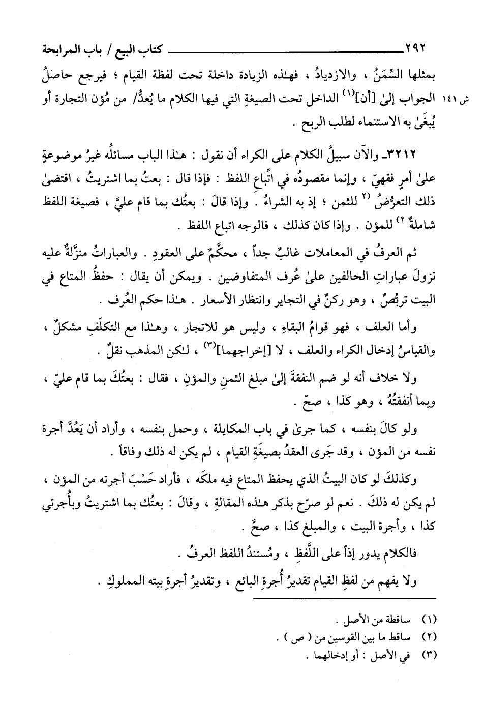 3212 - والآن سبيلُ الكلام على الكراء أن نقول: هذا الباب مسائلُه غيرُ موضوعةٍ على أمرٍ فقهيّ، وإنما مقصودُه في اتِّباعِ اللفظ: فإذا قال: بعتُ بما اشتريتُ، اقتضى ذلك التعرُّضُ (2 للثمن؛ إذ به الشراءُ. وإذا قالَ: بعتُك بما قام عليَّ، فصيغة اللفظ شاملةٌ 2) للمؤن. وإذا كان كذلك، فالوجه اتباع اللفظ.