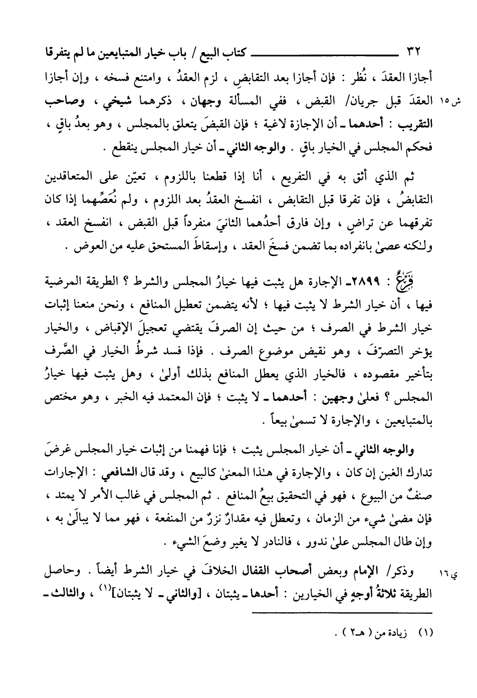 2899 - الإجارة هل يثبت فيها خيارُ المجلس والشرط؟ الطريقة المرضية فيها، أن خيار الشرط لا يثبت فيها؛ لأنه يتضمن تعطيل المنافع، ونحن منعنا إثبات خيار الشرط في الصرف؛ من حيث إن الصرفَ يقتضي تعجيلَ الإقباض، والخيار يؤخر التصرّفَ، وهو نقيض موضوع الصرف. فإذا فسد شرطُ الخيار في الصَّرف بتأخير مقصوده، فالخيار الذي يعطل المنافع بذلك أولى، وهل يثبت فيها خيارُ المجلس؟ فعلى وجهين: أحدهما - لا يثبت؛ فإن المعتمد فيه الخبر، وهو مختص بالمتبايعين، والإجارة لا تسمى بيعاً.