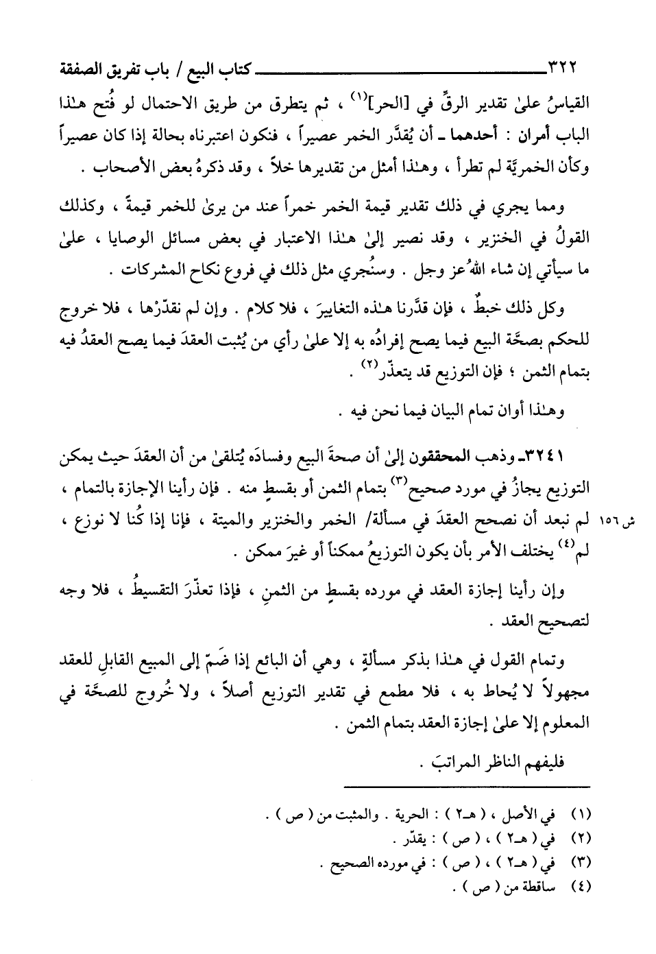 3241 - وذهب المحققون إلى أن صحةَ البيع وفسادَه يُتلقى من أن العقدَ حيث يمكن التوزيع يجازُ في مورد صحيح (3) بتمام الثمن أو بقسطٍ منه. فإن رأينا الإجازة بالتمام، لم نبعد أن نصحح العقدَ في مسألة الخمر والخنزير والميتة، فإنا إذا كُنا لا نوزع، لم (4) يختلف الأمر بأن يكون التوزيعُ ممكناً أو غيرَ ممكن.