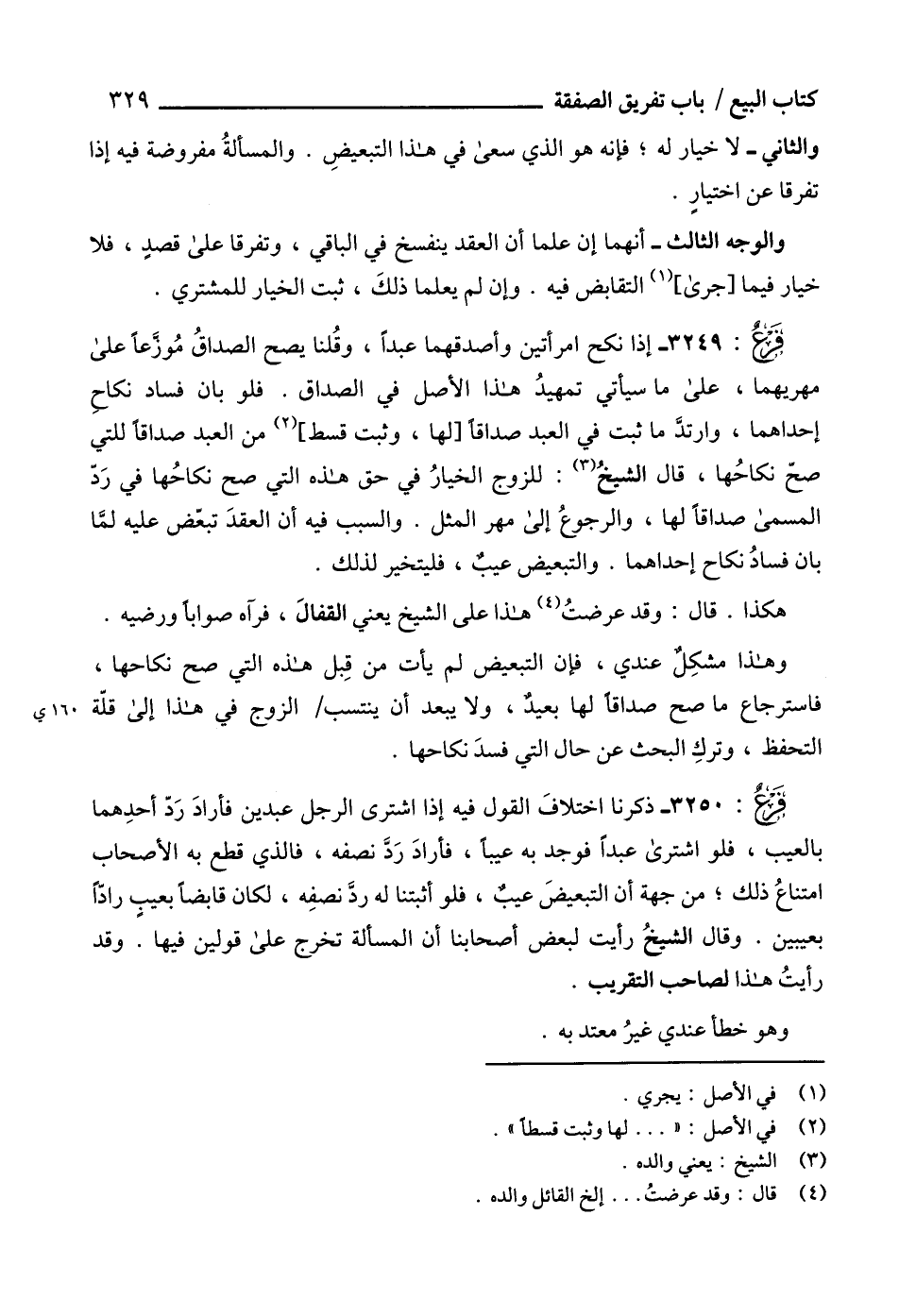 3250 - ذكرنا اختلافَ القول فيه إذا اشترى الرجل عبدين فأرادَ رَدّ أحدِهما بالعيب، فلو اشترى عبداً فوجد به عيباً، فأرادَ رَدَّ نصفه، فالذي قطع به الأصحاب امتناعُ ذلك؛ من جهة أن التبعيضَ عيبٌ، فلو أثبتنا له ردَّ نصفِه، لكان قابضاً بعيبٍ رادّاً بعيبين. وقال الشيخُ رأيت لبعض أصحابنا أن المسألة تخرج على قولين فيها. وقد رأيتُ هذا لصاحب التقريب.