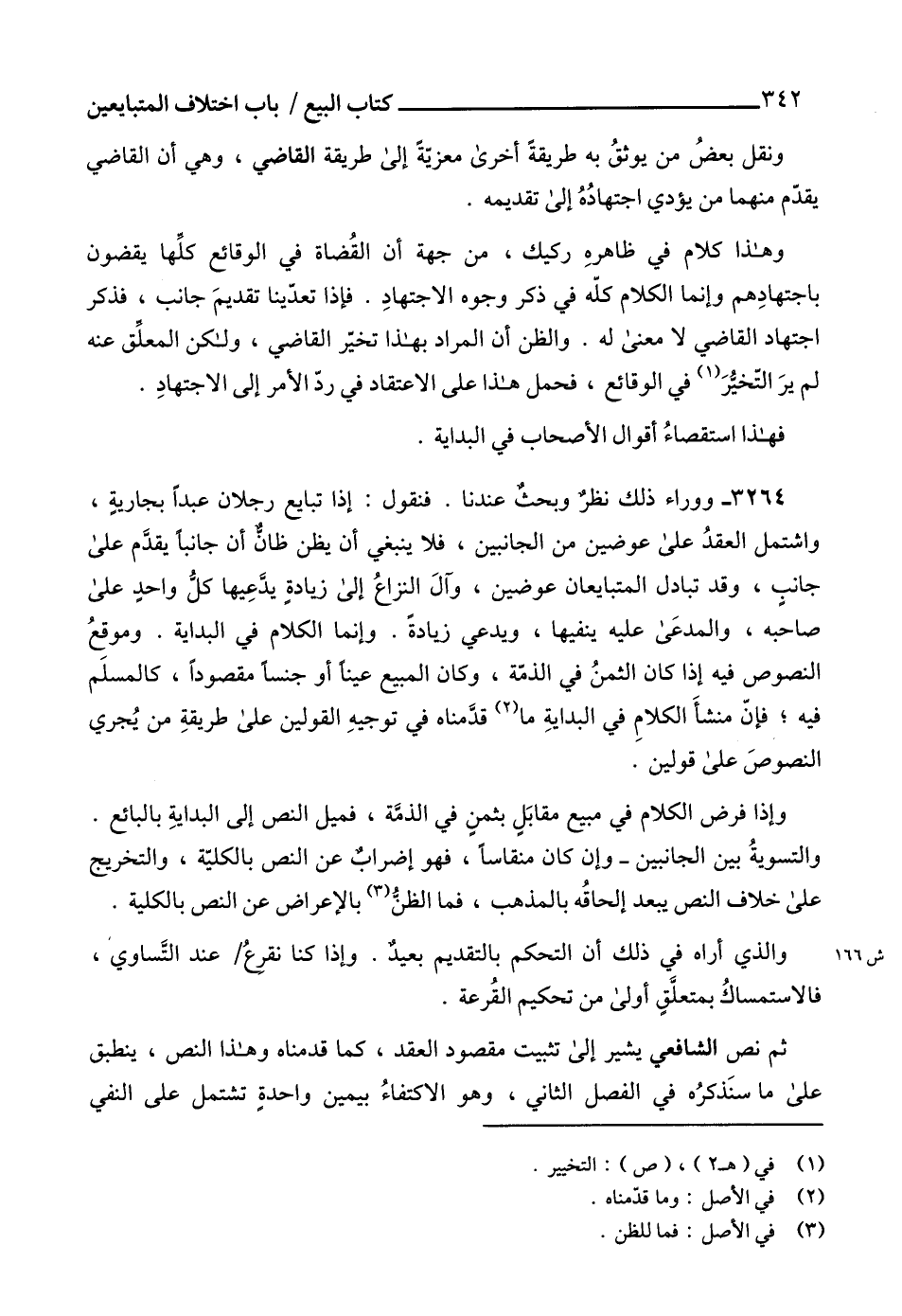 3264 - ووراء ذلك نظر وبحثٌ عندنا. فنقول: إذا تبايع رجلان عبداً بجاريةٍ، واشتمل العقدُ على عوضين من الجانبين، فلا ينبغي أن يظن ظانٌّ أن جانباً يقدَّم على جانبٍ، وقد تبادل المتبايعان عوضين، وآلَ النزاعُ إلى زيادةٍ يدَّعِيها كلُّ واحدٍ على صاحبه، والمدعَى عليه ينفيها، ويدعي زيادةً. وإنما الكلام في البداية. وموقعُ النصوص فيه إذا كان الثمنُ في الذمّة، وكان المبيع عيناً أو جنساً مقصوداً، كالمسلَم فيه؛ فإنّ منشأَ الكلامِ في البدايةِ ما (2) قدَّمناه في توجيهِ القولين على طريقةِ من يُجري النصوصَ على قولين.
