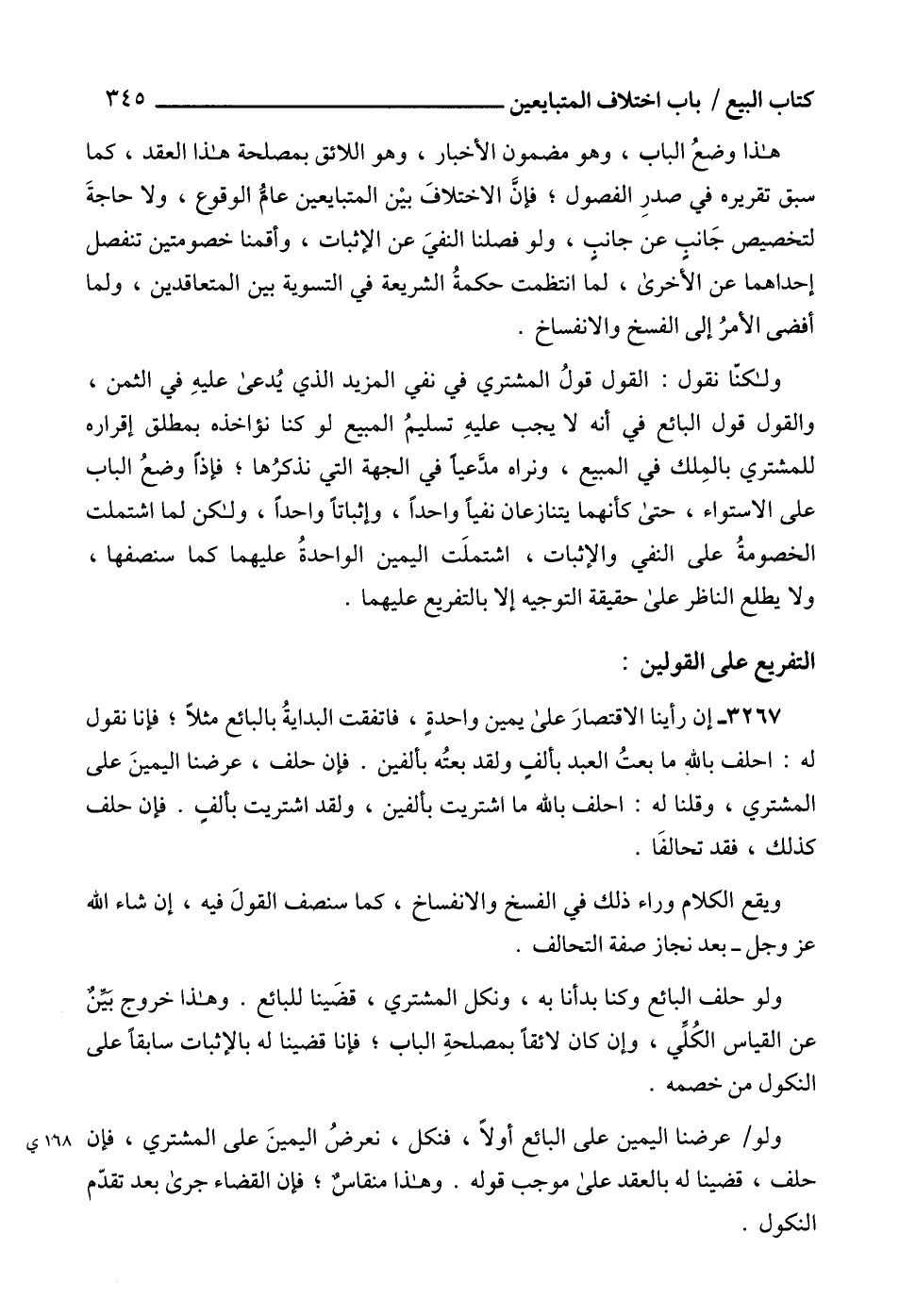 هذا وضعُ الباب، وهو مضمون الأخبار، وهو اللائق بمصلحة هذا العقد، كما سبق تقريره في صدرِ الفصول؛ فإنَّ الاختلافَ بيْن المتبايعين عامُّ الوقوع، ولا حاجةَ لتخصيص جَانب عن جانبٍ، ولو فصلنا النفيَ عن الإثبات، وأقمنا خصومتين تنفصل إحداهما عن الأخرى، لما انتظمت حكمةُ الشريعة في التسوية بين المتعاقدين، ولما أفضى الأمرُ إلى الفسخ والانفساخ.