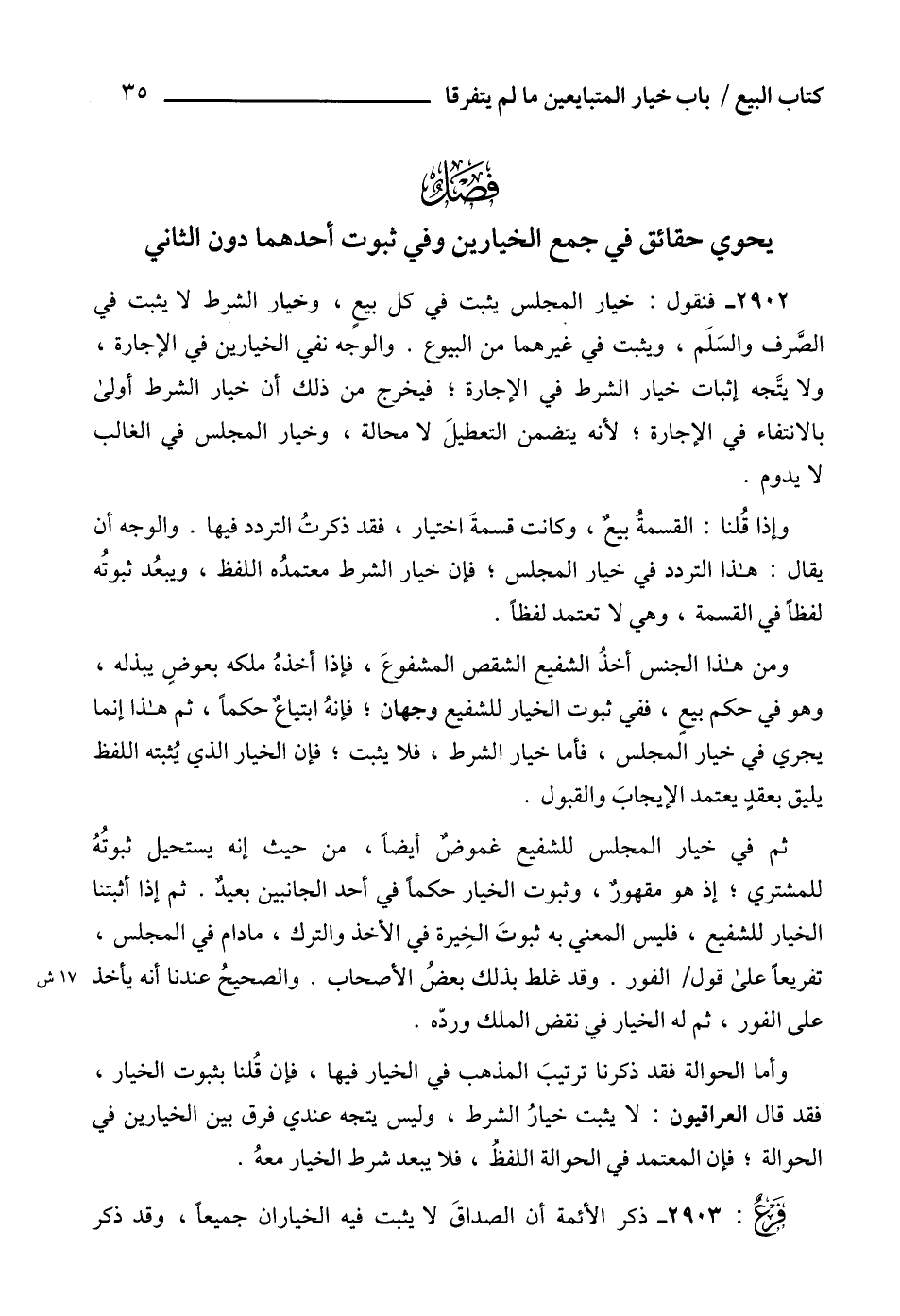 2902 - فنقول: خيار المجلس يثبت في كل بيعٍ، وخيار الشرط لا يثبت في الصَّرف والسَلَم، ويثبت في غيرهما من البيوع. والوجه نفي الخيارين في الإجارة، ولا يتَّجه إثبات خيار الشرط في الإجارة؛ فيخرج من ذلك أن خيار الشرط أولى بالانتفاء في الإجارة؛ لأنه يتضمن التعطيلَ لا محالة، وخيار المجلس في الغالب لا يدوم.