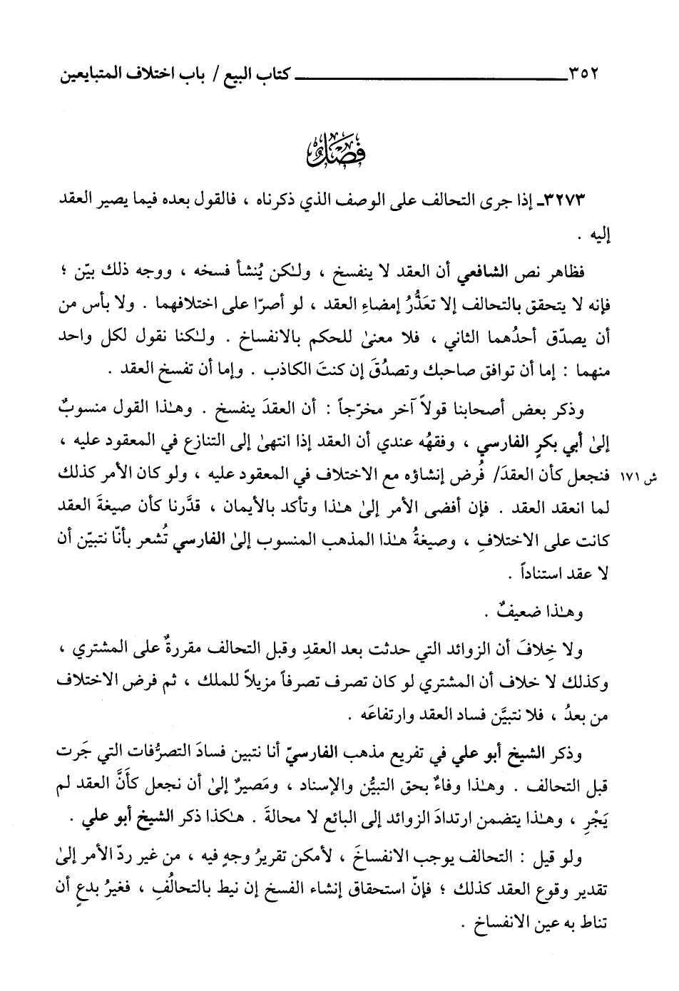 وذكر الشيخ أبو علي في تفريع مذهب الفارسيّ أنا نتبين فسادَ التصرّفات التي جَرت قبل التحالف. وهذا وفاءٌ بحق التبيُّن والإسناد، ومَصيرٌ إلى أن نجعل كأَنَّ العقد لم يَجْرِ، وهذا يتضمن ارتدادَ الزوائد إلى البائع لا محالةَ. هكذا ذكر الشيخ أبو علي.