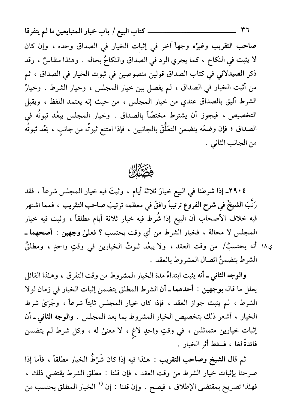 2904 - إذا شرطنا في البيع خيارَ ثلاثة أيام، وثبتَ فيه خيار المجلس شرعاً، فقد رَتَّبَ الشيخُ في شرح الفروع ترتيباً وافقَ في معظمه ترتيبَ صاحب التقريب، فمما اشتهر فيه خلاف الأصحاب أن البيع إذا شُرط فيه خيار ثلاثة أيام مطلقاً، وثبت فيه خيار المجلس لا محالة، فخيار الشرط من أي وقت يحتسب؟ فعلى وجهين: أصحهما - أنه يحتسبُ من وقت العقد، ولا يبعُد ثبوتُ الخيارين في وقتٍ واحدٍ، ومطلقُ الشرط يتضمنُ اتصال المشروط بالعقد.