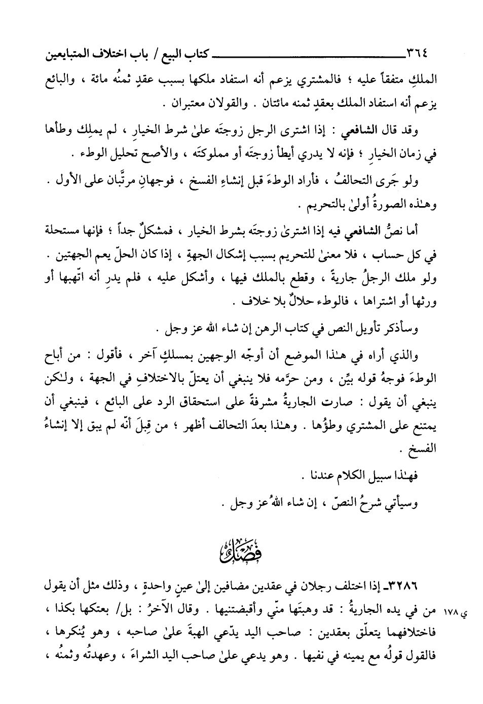 3286 - إذا اختلف رجلان في عقدين مضافين إلى عينٍ واحدة، وذلك مثل أن يقول من في يده الجاريةُ: قد وهبتَها منّي وأقبضتنيها. وقال الآخرُ: بل بعتكها بكذا، فاختلافهما يتعلّق بعقدين: صاحب اليد يدّعي الهبةَ على صاحبه، وهو يُنكرها، فالقول قولُه مع يمينه في نفيها. وهو يدعي على صاحب اليد الشراءَ، وعهدتُه وثمنُه،
