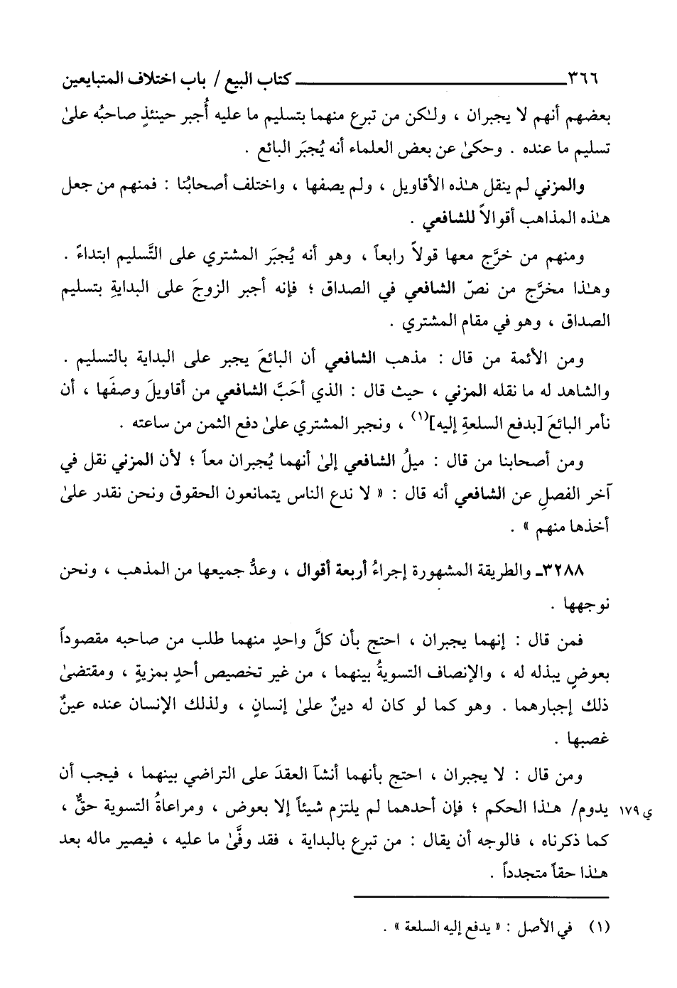 والشاهد له ما نقله المزني، حيث قال: الذي أحَبَّ الشافعي من أقاويلَ وصفَها، أن نأمر البائعَ [بدفع السلعةِ إليه] (1)، ونجبر المشتري على دفع الثمن من ساعته.
