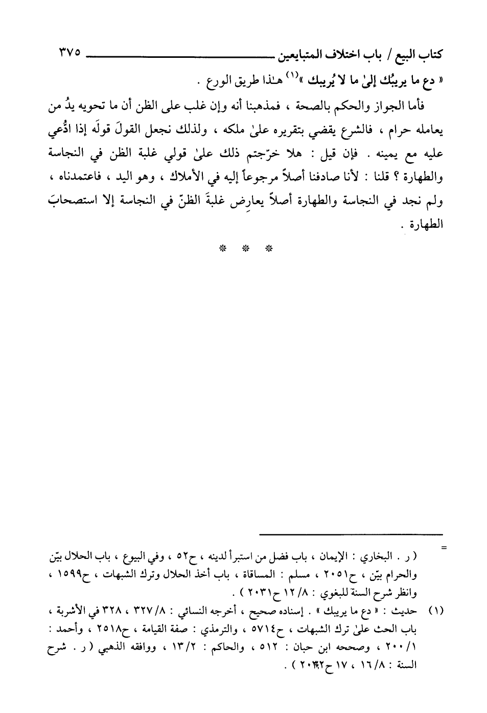 (1) حديث: " دع ما يريبك ". إسناده صحيح، أخرجه النسائي: 8/ 327، 328 في الأشربة، باب الحث على ترك الشبهات، ح 5714، والترمذي: صفة القيامة، ح 2518، وأحمد: 1/ 200، وصححه ابن حبان: 512، والحاكم: 2/ 13، ووافقه الذهبي (ر. شرح السنة: 8/ 16، 17 ح 2032).