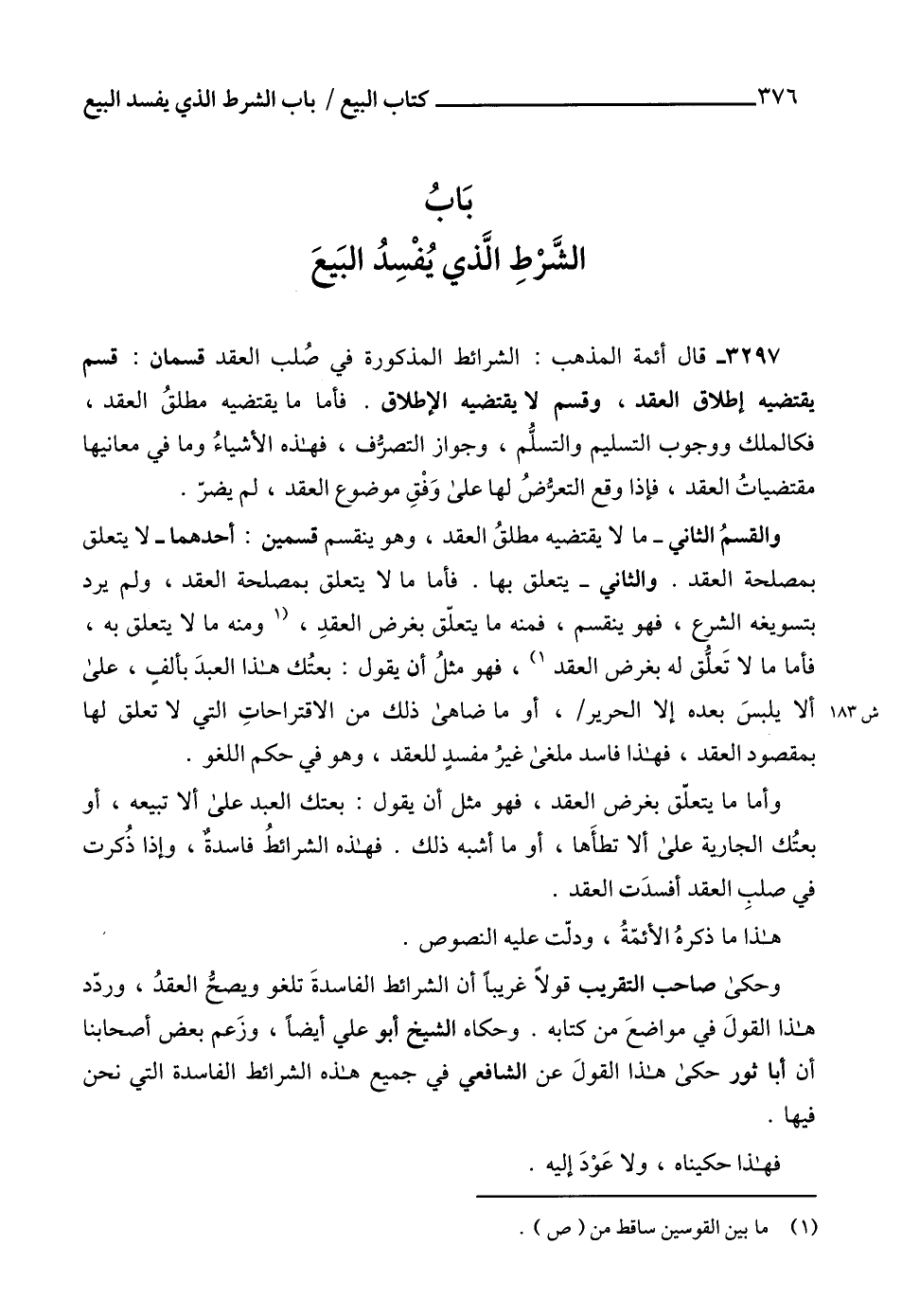 3297 - قال أئمة المذهب: الشرائط المذكورة في صُلب العقد قسمان: قسم يقتضيه إطلاق العقد، وقسم لا يقتضيه الإطلاق. فأما ما يقتضيه مطلقُ العقد، فكالملك ووجوب التسليم والتسلُّم، وجواز التصرُّف، فهذه الأشياءُ وما في معانيها مقتضياتُ العقد، فإذا وقع التعرُّضُ لها على وَفْقِ موضوع العقد، لم يضرّ.