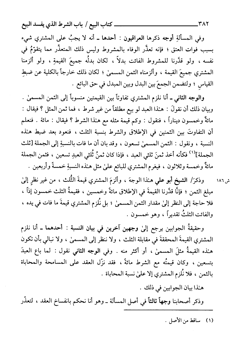 وحقيقةُ الجوابين يرجع إلى وجهين آخرين في بيان النسبة: أحدهما - أنا نلزم المشتري القيمةَ المحققةَ في مقابلة الثلث، ولا ننظر إلى المسمى، ولا نبالي بأن تكون هذه القيمةُ مثلَ المسمى، أو أكثر منه. وفي الوجه الثاني نقول: لما باع العبدَ بتسعين، وكان قيمتُه مع الشرط مائة، فقد نزّل العقد على المسامحة والمحاباة بالثمن، فلا نُلزم المشتري إلا على نسبة المحاباة.