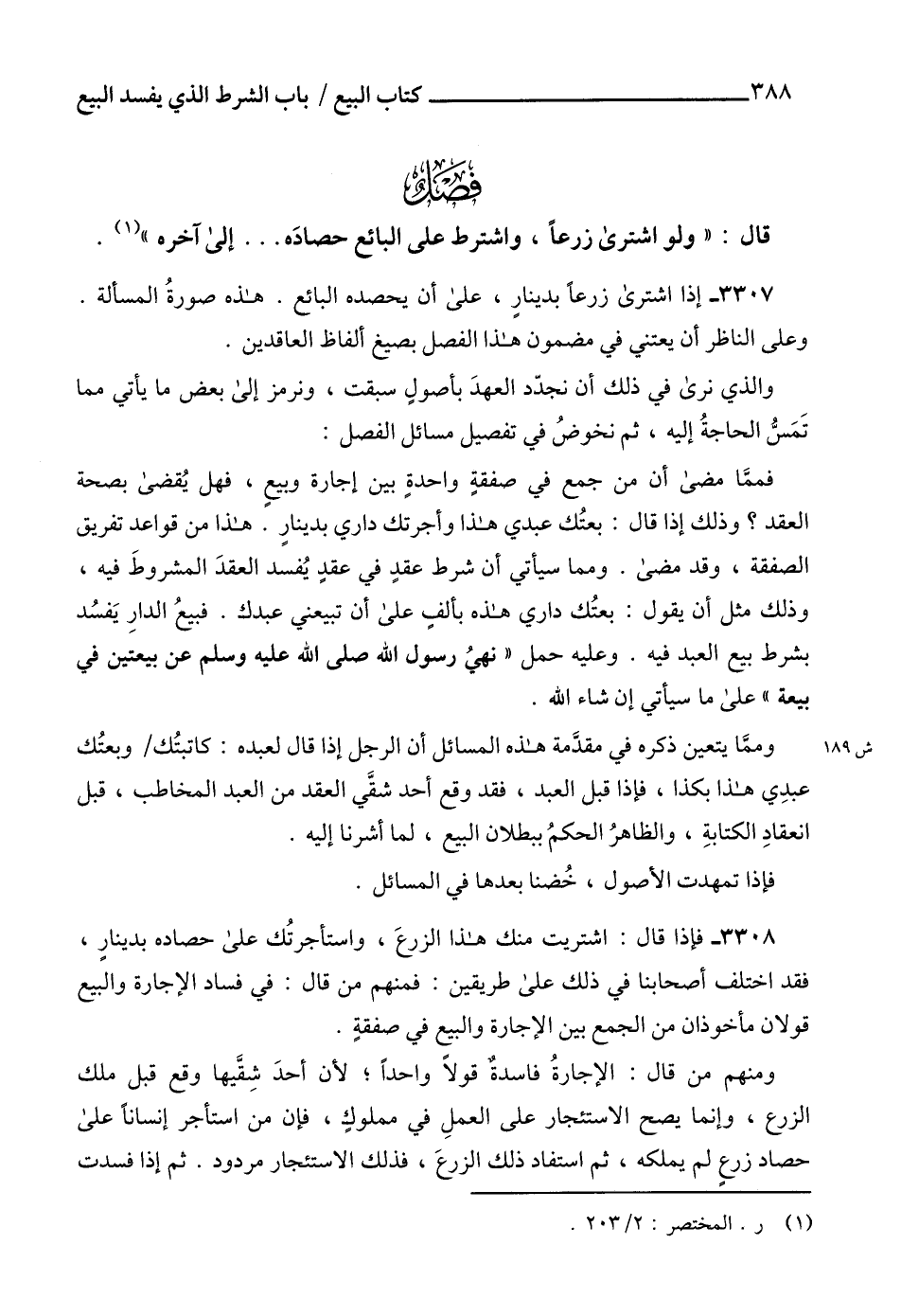 3307 - إذا اشترى زرعاً بدينارٍ، على أن يحصده البائع. هذه صورةُ المسألة. وعلى الناظر أن يعتني في مضمون هذا الفصل بصيغ ألفاظ العاقدين.