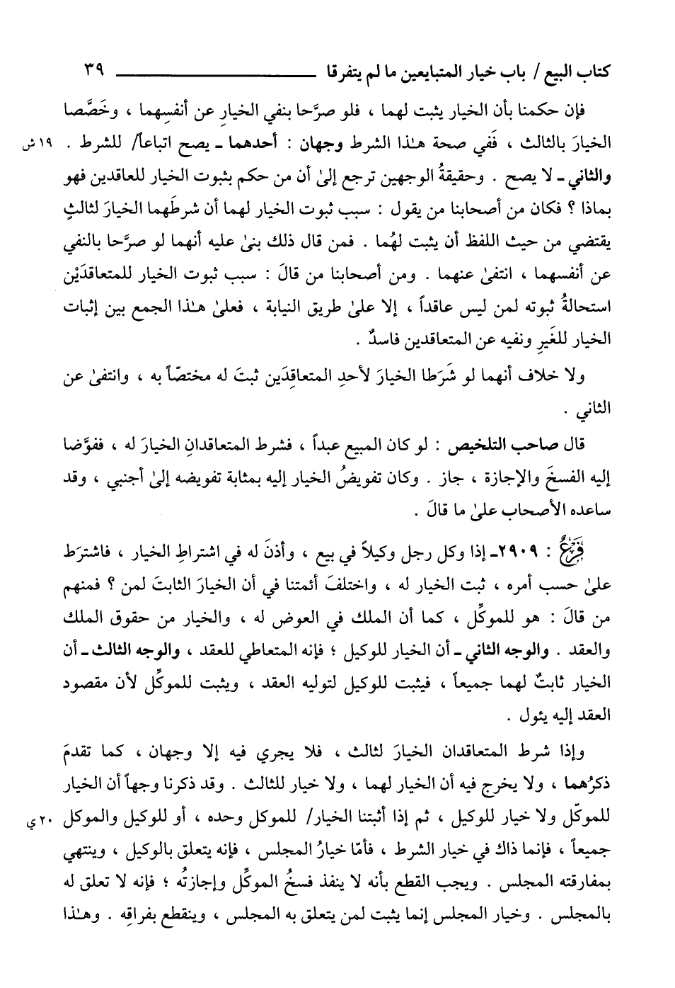 2909 - إذا وكل رجل وكيلاً في بيع، وأذنَ له في اشتراطِ الخيار، فاشترَط على حسب أمره، ثبت الخيار له، واختلفَ أئمتنا في أن الخيارَ الثابتَ لمن؟ فمنهم من قالَ: هو للموكِّل، كما أن الملك في العوض له، والخيار من حقوق الملك والعقد. والوجه الثاني - أن الخيار للوكيل؛ فإنه المتعاطي للعقد، والوجه الثالث - أن الخيار ثابتٌ لهما جميعاً، فيثبت للوكيل لتوليه العقد، ويثبت للموكِّل لأن مقصود العقد إليه يئول.