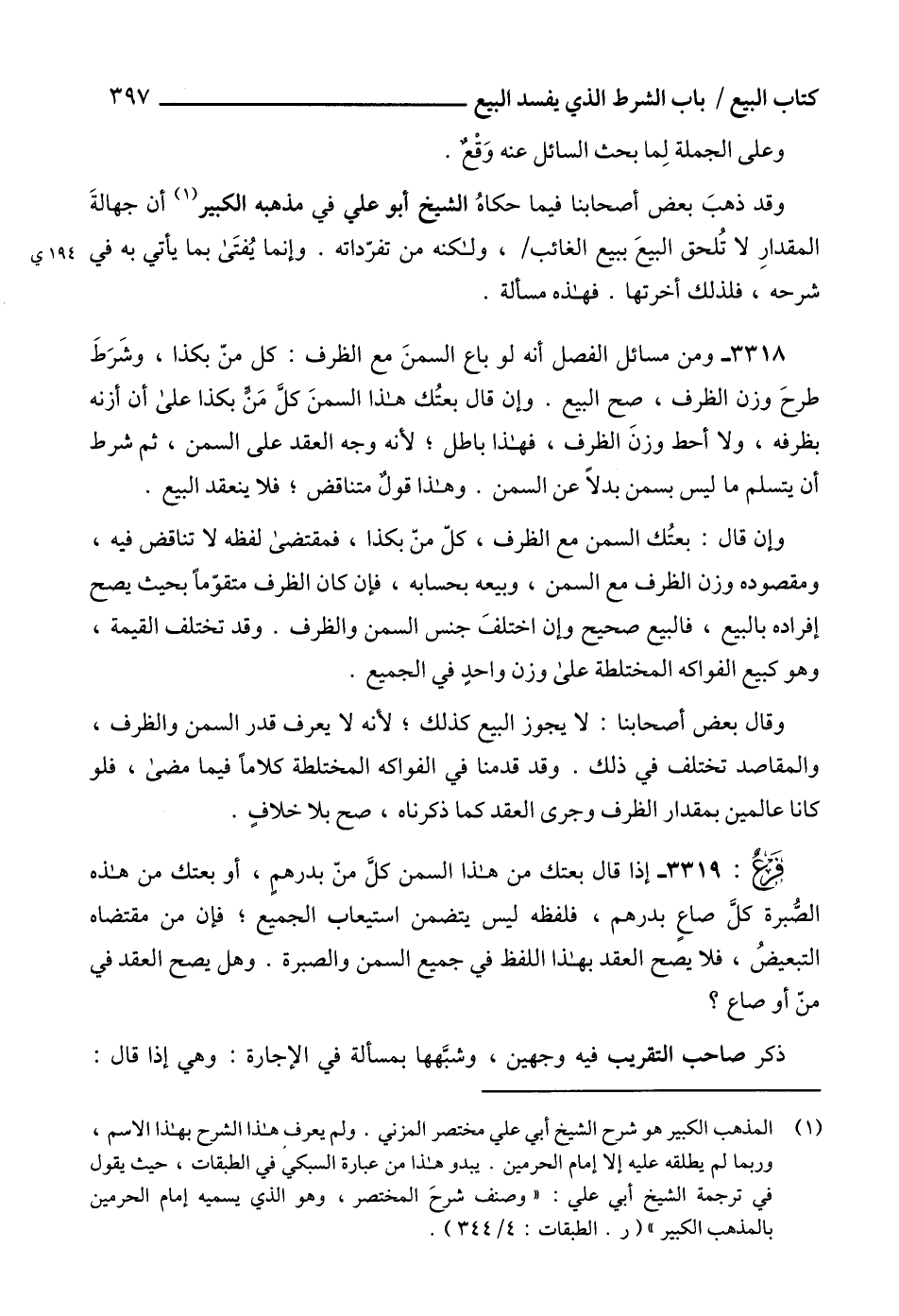 3318 - ومن مسائل الفصل أنه لو باع السمنَ مع الظرف: كل منّ بكذا، وشَرَطَ طرحَ وزن الظرف، صح البيع. وإن قال بعتُك هذا السمنَ كلَّ مَن بكذا على أن أزنه بظرفه، ولا أحط وزنَ الظرف، فهذا باطل؛ لأنه وجه العقد على السمن، ثم شرط أن يتسلم ما ليس بسمن بدلاً عن السمن. وهذا قولٌ متناقض؛ فلا ينعقد البيع.