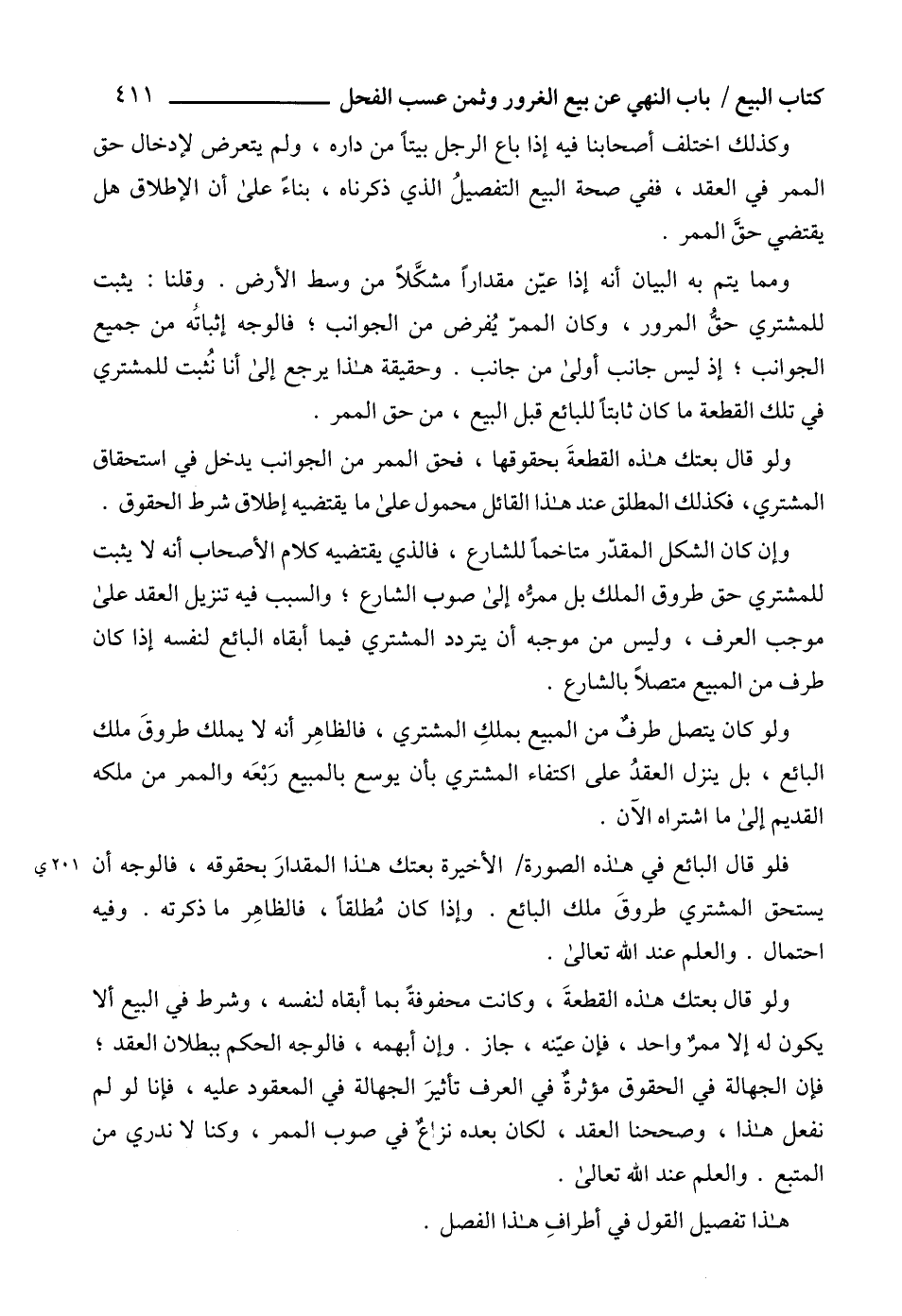 ومما يتم به البيان أنه إذا عيّن مقداراً مشكَّلاً من وسط الأرض. وِقلنا: يثبت للمشتري حقُّ المرور، وكان الممرّ يُفرض من الجوانب؛ فالوجه إثباته من جميع الجوانب؛ إذ ليس جانب أولى من جانب. وحقيقة هذا يرجع إلى أنا نُثبت للمشتري في تلك القطعة ما كان ثابتاً للبائع قبل البيع، من حق الممر.