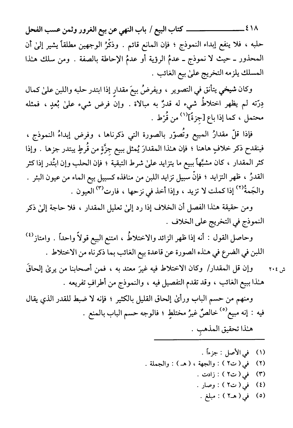 حلبه، فلا ينفع إبداء النموذج؛ فإن المانع قائم. وذكْرُ الوجهين مطلقاً يشير إلى أن المحذور -حيث لا نموذج- عدمُ الرؤية أو عدمُ الإحاطة بالصفة. ومن سلك هذا المسلك يلزمه التخريج على بيع الغائب.