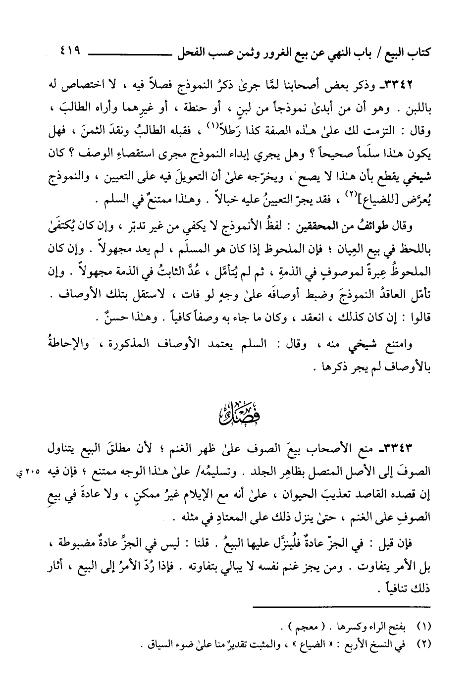 3343 - منع الأصحاب بيعَ الصوف على ظهر الغنم؛ لأن مطلقَ البيع يتناول الصوفَ إلى الأصل المتصل بظاهِر الجلد. وتسليمُه على هذا الوجه ممتنع؛ فإن فيه إن قصده القاصد تعذيبَ الحيوان، على أنه مع الإيلام غيرُ ممكنٍ، ولا عادةَ في بيعِ الصوفِ على الغنم، حتى ينزل ذلك على المعتادِ في مثله.