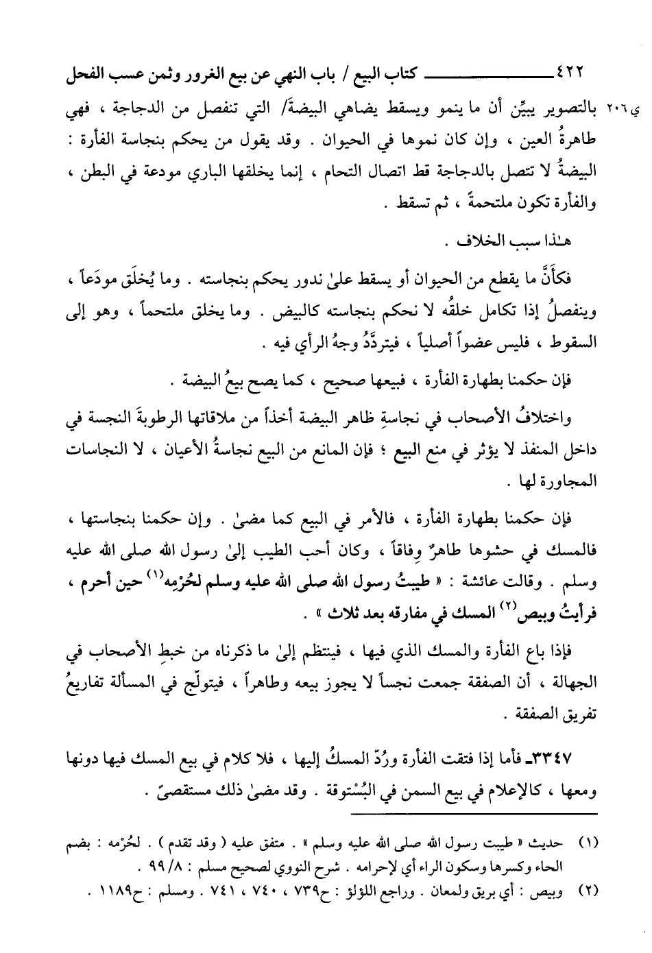 3347 - فأما إذا فتقت الفأرة ورُدّ المسكُ إليها، فلا كلام في بيع المسك فيها دونها ومعها، كالإعلام في بيع السمن في البُسْتوقة. وقد مضى ذلك مستقصىً.