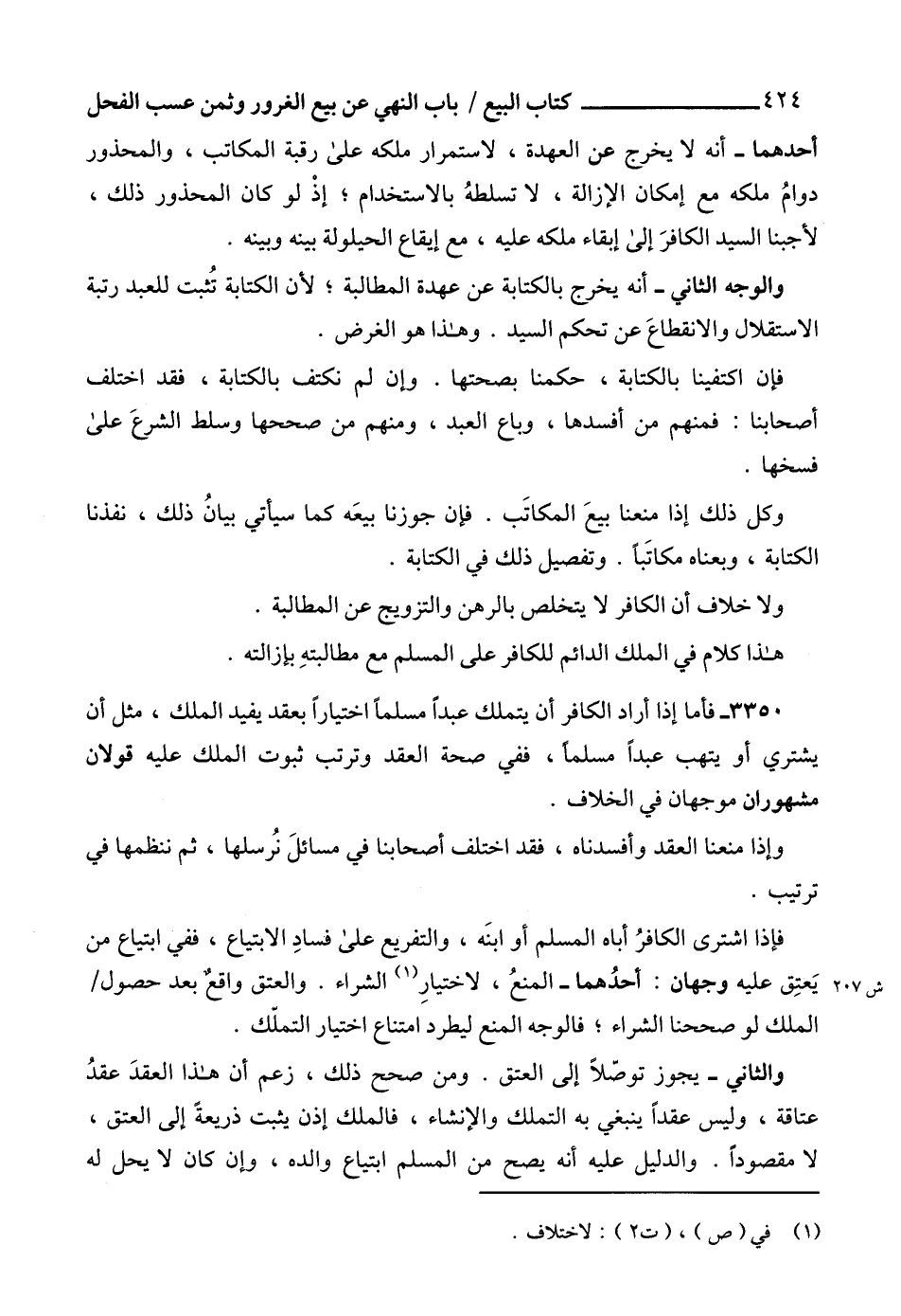 3350 - فأما إذا أراد الكافر أن يتملك عبداً مسلماً اختياراً بعقد يفيد الملك، مثل أن يشتري أو يتهب عبداً مسلماً، ففي صحة العقد وترتب ثبوت الملك عليه قولان مشهوران موجهان في الخلاف.
