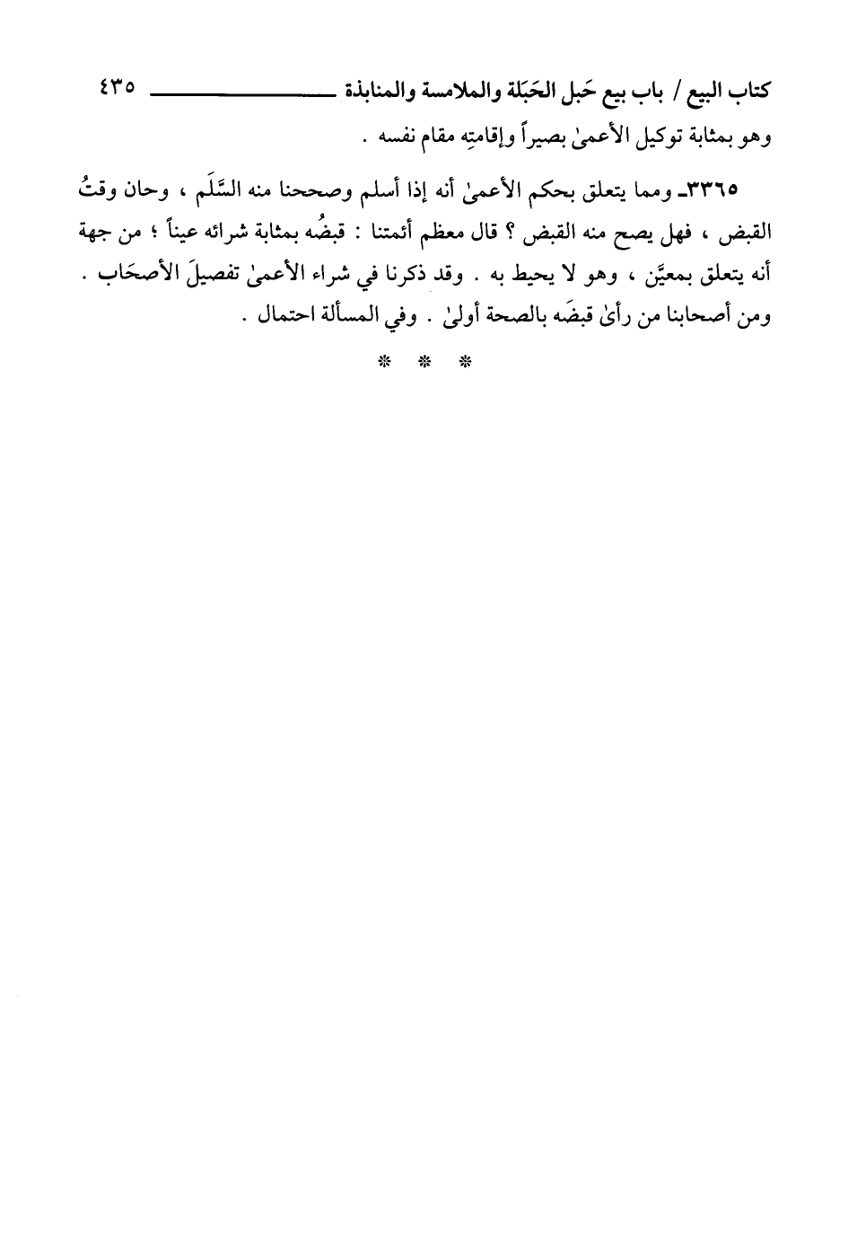 3365 - ومما يتعلق بحكم الأعمى أنه إذا أسلم وصححنا منه السَّلَم، وحان وقتُ القبض، فهل يصح منه القبض؟ قال معظم أئمتنا: قبضُه بمثابة شرائه عيناً؛ من جهة أنه يتعلق بمعيَّن، وهو لا يحيط به. وقد ذكرنا في شراء الأعمى تفصيلَ الأصحَاب.