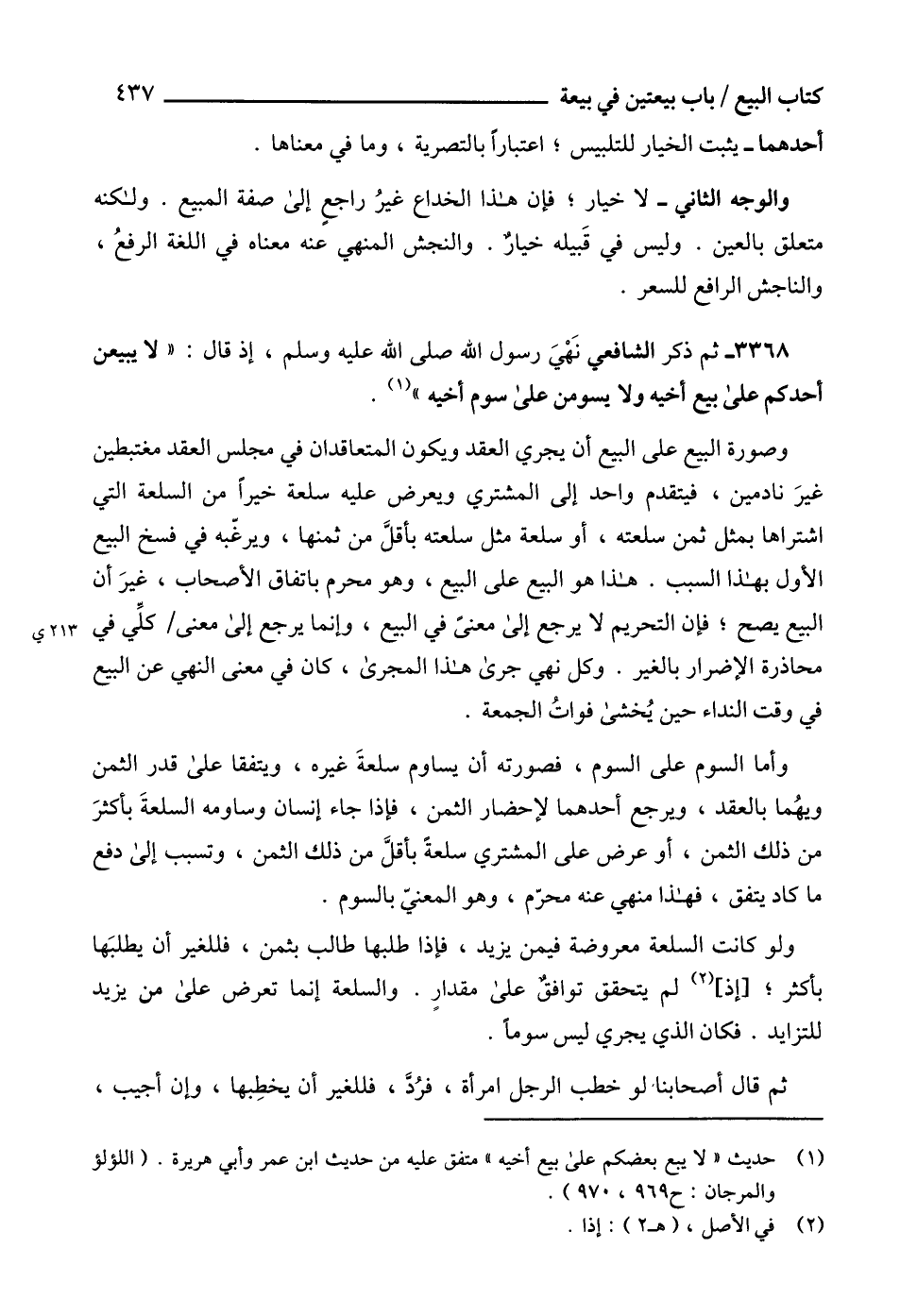 3368 - ثم ذكر الشافعي نَهْيَ رسول الله صلى الله عليه وسلم، إذ قال: " لا يبيعن أحدكم على بيع أخيه ولا يسومن على سوم أخيه " (1).