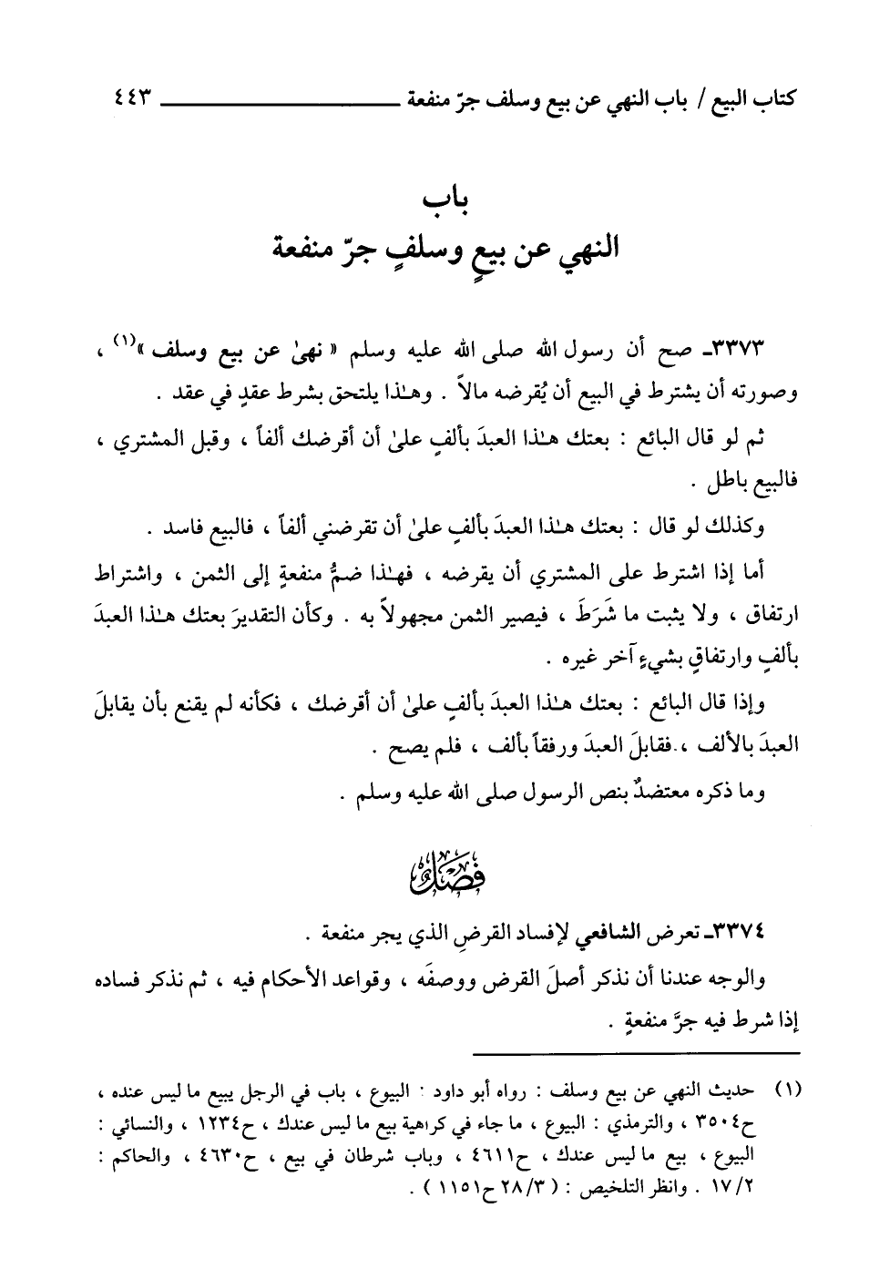 3374 - تعرض الشافعي لإفساد القرضِ الذي يجر منفعة.