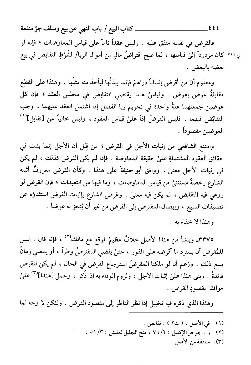 وامتنع الشافعي من إثبات الأجل في القرض؛ من قِبَل أن الأجل إنما يثبت في حقائق العقود المشتملةِ على حقيقة المعاوضة. فإذا لم يكن القرض كذلك، لم يكن في إثبات الأجل معنى، ووافق أبو حنيفةَ على هذا. وكان القرض معروفٌ أثبته الشارع رخصةً مستثنى من قياس المعاوضات، وما فيها من التعبدات؛ فإن القرض لو روعي فيه التقابض، لم يكن فيه معنى. وغرض الشارع بإثبات القرض استثناؤه عن تصنيفات المبيع، وإيصال المقترض إلى القرض من غير أن يُنجز له عوضاً.
