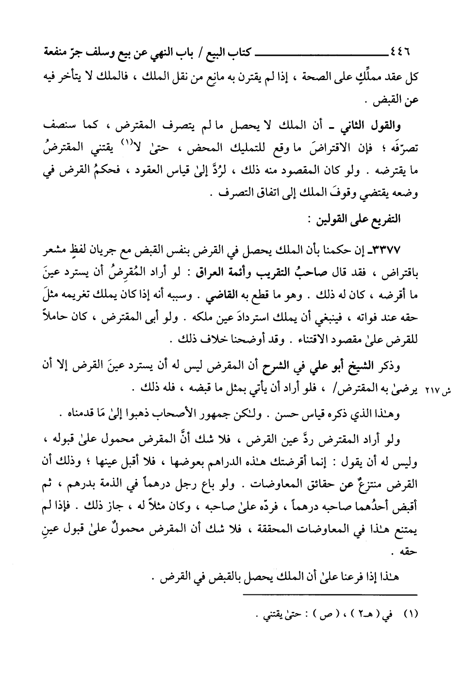3377 - إن حكمنا بأن الملك يحصل في القرض بنفس القبض مع جريان لفظٍ مشعر باقتراض، فقد قال صاحبُ التقريب وأئمة العراق: لو أراد المُقرِضُ أن يسترد عينَ ما أقرضه، كان له ذلك. وهو ما قطع به القاضي. وسببه أنه إذا كان يملك تغريمه مثلَ حقه عند فواته، فينبغي أن يملك استردادَ عين ملكه. ولو أبى المقترض، كان حاملاً للقرض على مقصود الاقتناء. وقد أوضحنا خلاف ذلك.