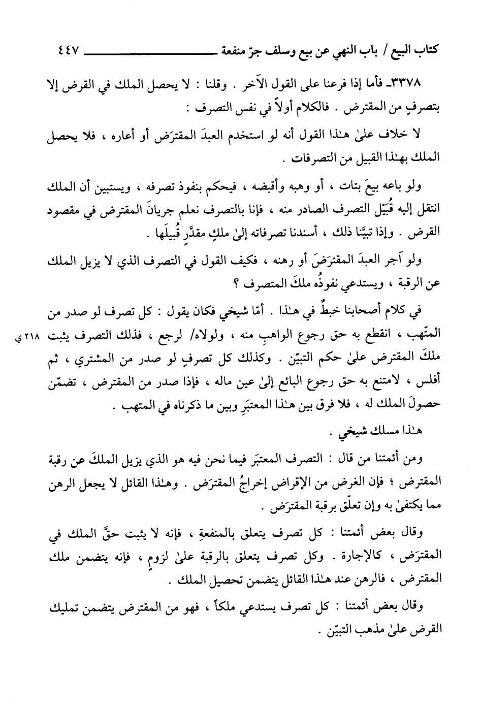 3378 - فأما إذا فرعنا على القول الآخر. وقلنا: لا يحصل الملك في القرض إلا بتصرفٍ من المقترض. فالكلام أولاً في نفس التصرف: