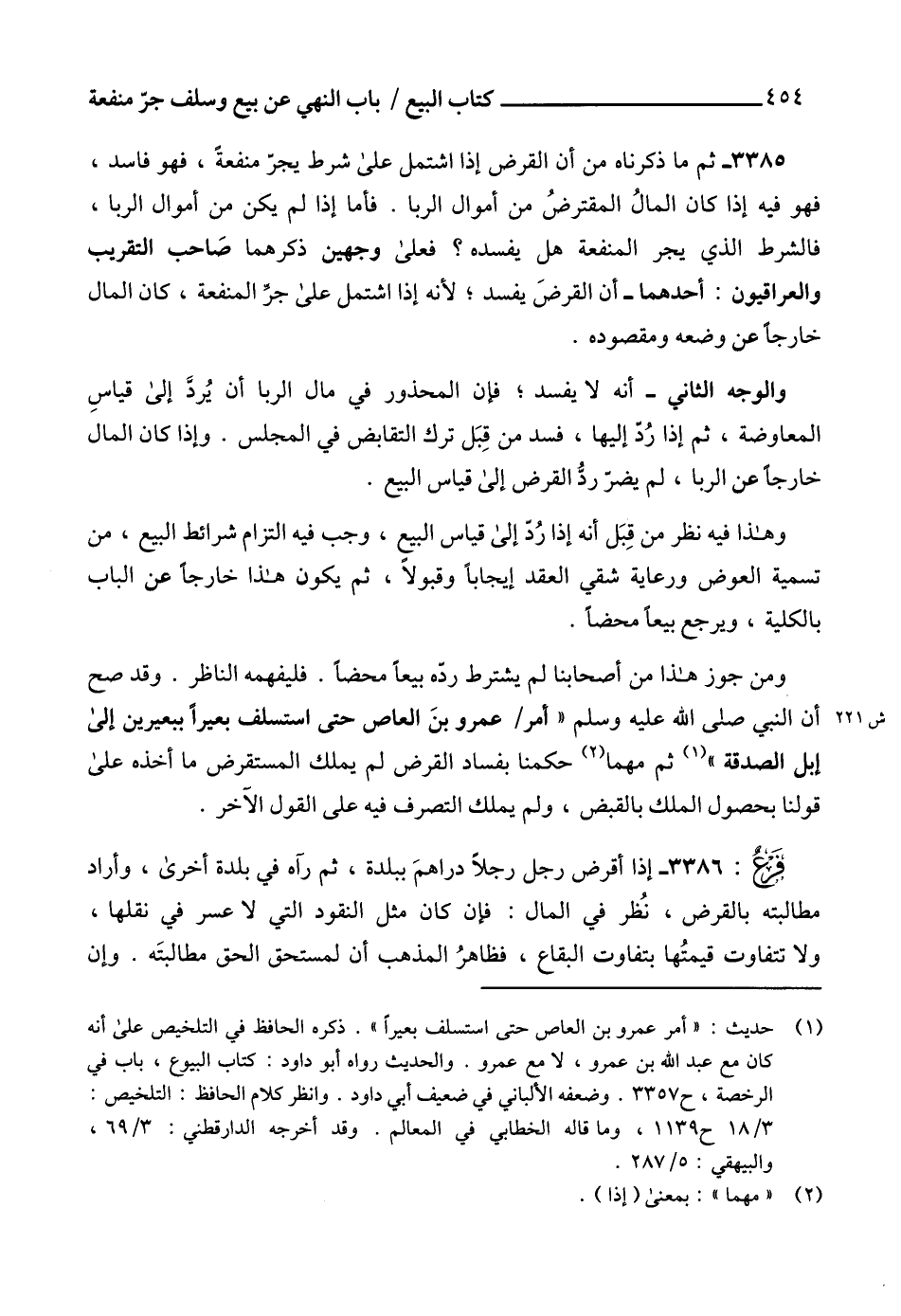 (1) حديث: " أمر عمرو بن العاص حتى استسلف بعيراً ". ذكره الحافظ في التلخيص على أنه كان مع عبد الله بن عمرو، لا مع عمرو. والحديث رواه أبو داود: كتاب البيوع، باب في الرخصة، ح 3357. وضعفه الألباني في ضعيف أبي داود. وانظر كلام الحافظ: التلخيص: 3/ 18 ح 1139، وما قاله الخطابي في المعالم. وقد أخرجه الدارقطني: 3/ 69، والبيهقي: 5/ 287.