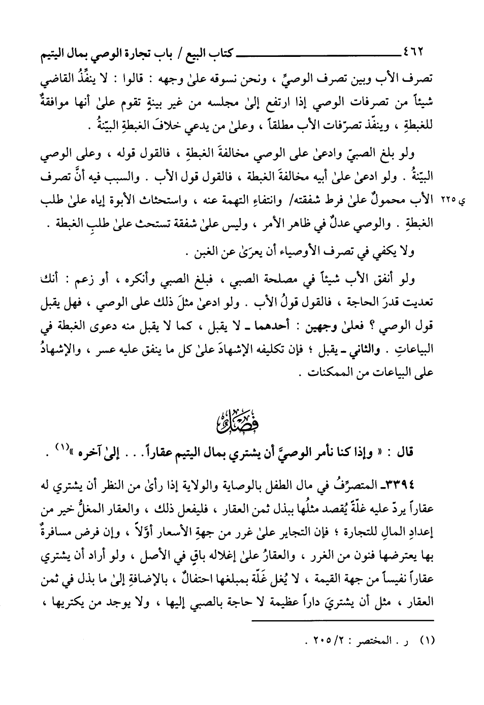 3394 - المتصرِّفُ في مال الطفل بالوصاية والولاية إذا رأى من النظر أن يشتري له عقاراً يردّ عليه غلّةً يُقصد مثلُها ببذل ثمن العقار، فليفعل ذلك، والعقار المغلُّ خير من إعدادِ المالِ للتجارة؛ فإن التجاير على غرر من جهةِ الأسعار أوَّلاَ، وإن فرض مسافرة بها يعترضها فنون من الغرر، والعقارُ على إغلاله باقٍ في الأصل، ولو أراد أن يشتري عقاراً نفيساً من جهة القيمة، لا يُغل غَلّة بمبلغها احتفالٌ، بالإضافةِ إلى ما بذل في ثمن العقار، مثل أن يشتريَ داراً عظيمة لا حاجة بالصبي إليها، ولا يوجد من يكتريها،