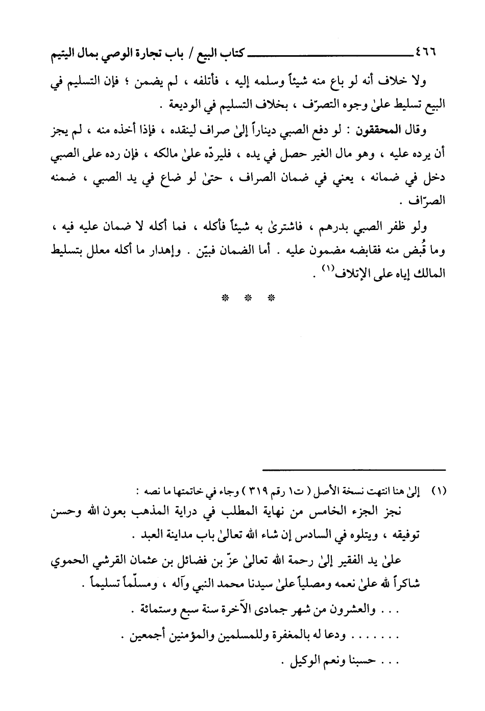 نجز الجزء الخامس من نهاية المطلب في دراية المذهب بعون الله وحسن توفيقه، ويتلوه في السادس إن شاء الله تعالى باب مداينة العبد.