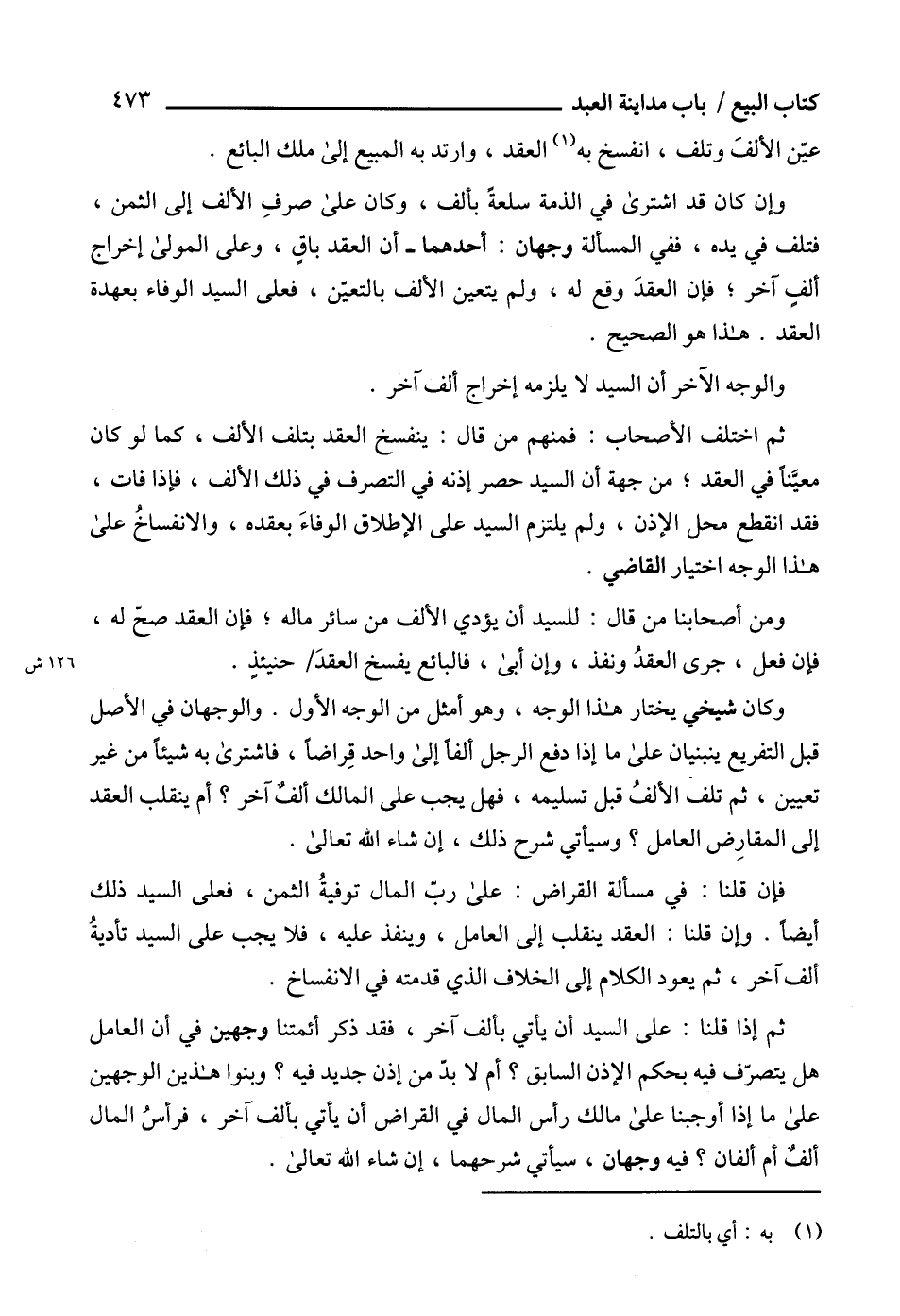 وإن كان قد اشترى في الذمة سلعةً بألف، وكان على صرفِ الألف إلى الثمن، فتلف في يده، ففي المسألة وجهان: أحدهما - أن العقد باقٍ، وعلى المولى إخراج ألفٍ آخر؛ فإن العقدَ وقع له، ولم يتعين الألف بالتعيّن، فعلى السيد الوفاء بعهدة العقد. هذا هو الصحيح.