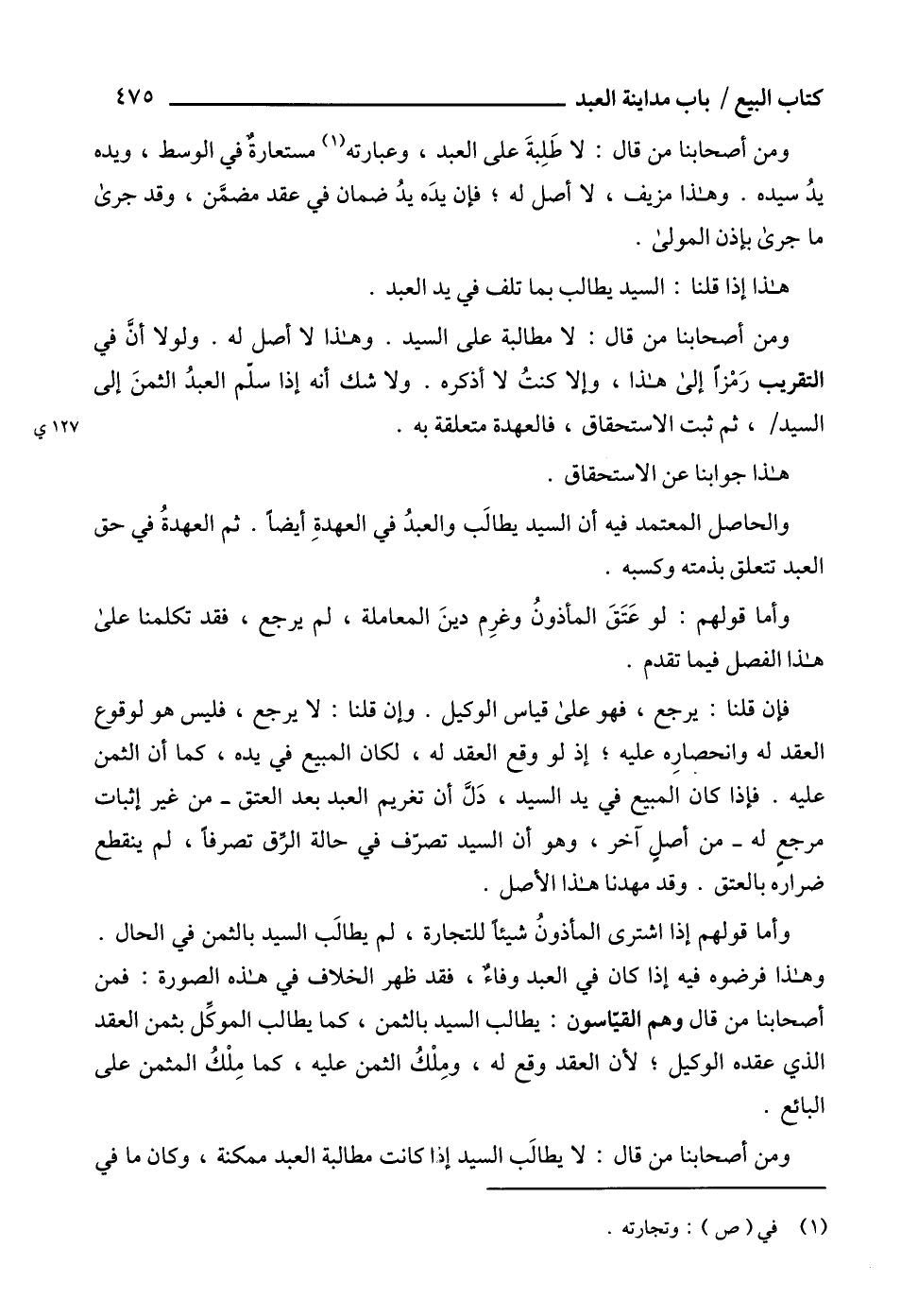 وهذا فرضوه فيه إذا كان في العبد وفاءٌ، فقد ظهر الخلاف في هذه الصورة: فمن أصحابنا من قال وهم القيّاسون: يطالب السيد بالثمن، كما يطالب الموكَل بثمن العقد الذي عقده الوكيل؛ لأن العقد وقع له، ومِلْكُ الثمن عليه، كما مِلْكُ المثمن على البائع.