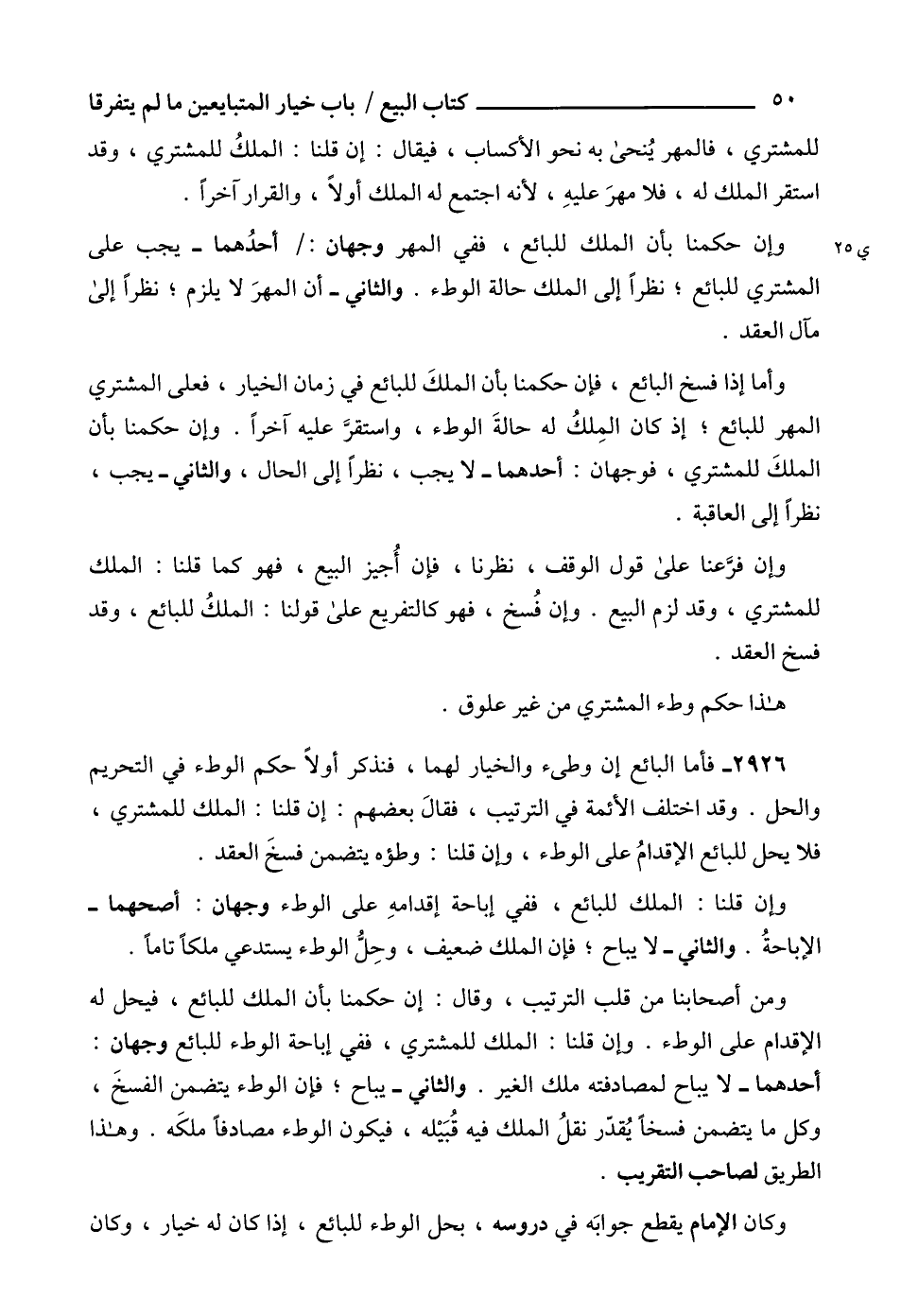 2926 - فأما البائع إن وطىء والخيار لهما، فنذكر أولاً حكم الوطء في التحريم والحل. وقد اختلف الأئمة في الترتيب، فقالَ بعضهم: إن قلنا: الملك للمشتري، فلا يحل للبائع الإقدامُ على الوطء، وإن قلنا: وطؤه يتضمن فسخَ العقد.