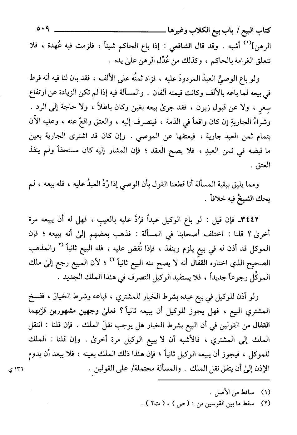 3442 - فإن قيل: لو باع الوكيل عبداً فرُدَّ عليه بالعيبِ، فهل له أن يبيعه مرة أخرى؟ قلنا: اختلف أصحابنا في المسألة: فذهب بعضهم إلى أنه يبيعه؛ فإن الموكل قد أذن له في بيعٍ يلزم وينفذ، فإذا نُقض عليه، فله البيع ثانياً (2 والمذهب الصحيح الذي اختاره القفال أنه لا يصح منه البيع ثانياً 2)؛ لأن المبيع رجع إلى ملك الموكَل رجوعاً جديداً، فلا يستفيد الوكيل التصرف في هذا الملك الجديد.