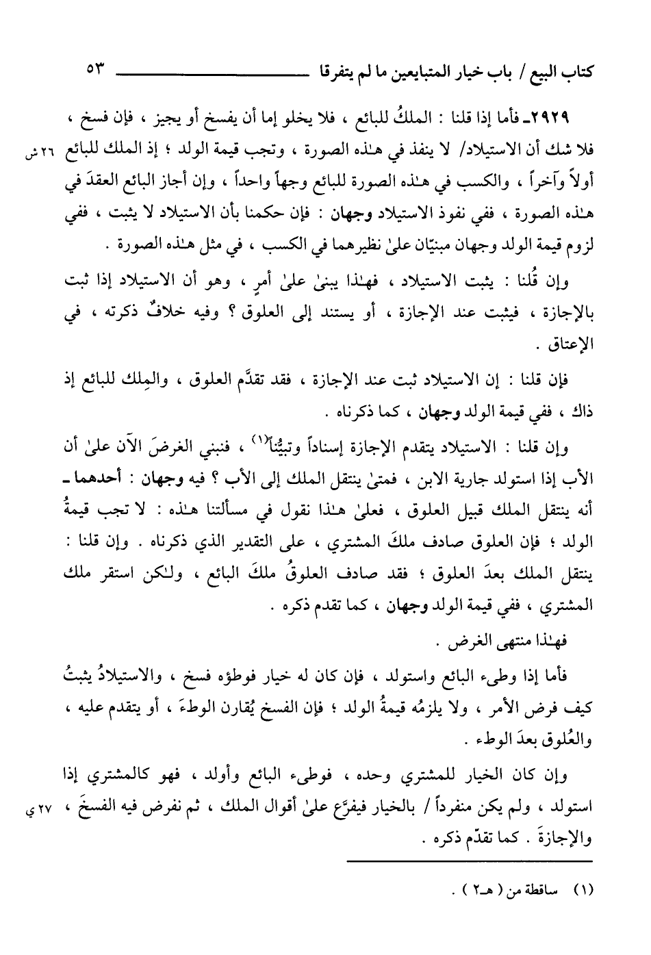 2929 - فأما إذا قلنا: الملكُ للبائع، فلا يخلو إما أن يفسخ أو يجيز، فإن فسخ، فلا شك أن الاستيلاد لا ينفذ في هذه الصورة، وتجب قيمة الولد؛ إذ الملك للبائع أولاً وآخراً، والكسب في هذه الصورة للبائع وجهاً واحداً، وإن أجاز البائع العقدَ في هذه الصورة، ففي نفوذ الاستيلاد وجهان: فإن حكمنا بأن الاستيلاد لا يثبت، ففي لزوم قيمة الولد وجهان مبنيّان على نظيرهما في الكسب، في مثل هذه الصورة.