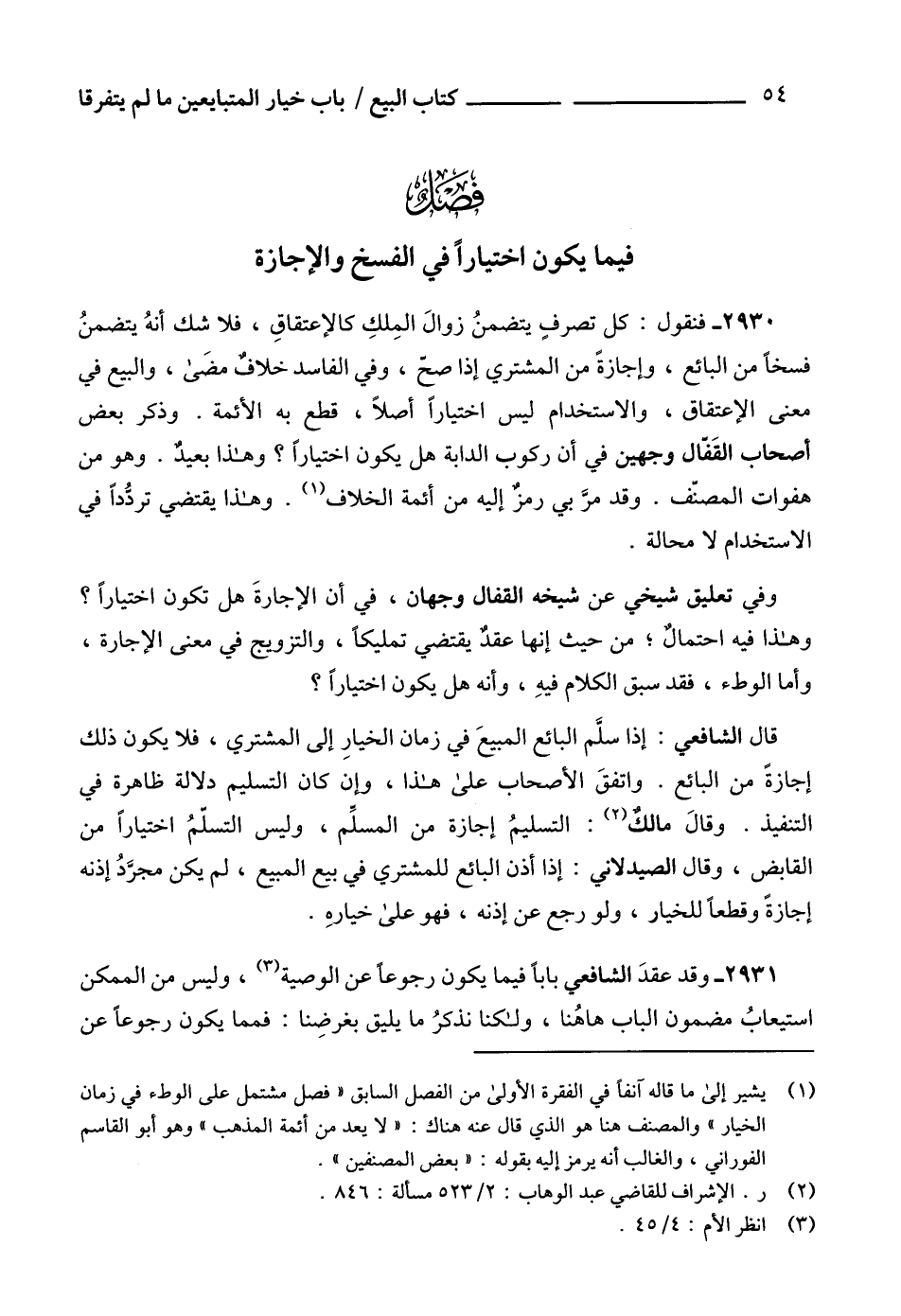 2930 - فنقول: كل تصرفٍ يتضمنُ زوالَ المِلكِ كالإعتقاقِ، فلا شك أنهُ يتضمنُ فسخاً من البائع، وإجازةً من المشتري إذا صحّ، وفي الفاسد خلافٌ مضَى، والبيع في معنى الإعتقاق، والاستخدام ليس اختياراً أصلاً، قطع به الأئمة. وذكر بعض أصحاب القَفاّل وجهين في أن ركوب الدابة هل يكون اختياراً؟ وهذا بعيدٌ. وهو من هفوات المصنف. وقد مرَّ بي رمزٌ إليه من أئمة الخلاف (1). وهذا يقتضي تردُّداً في الاستخدام لا محالة.