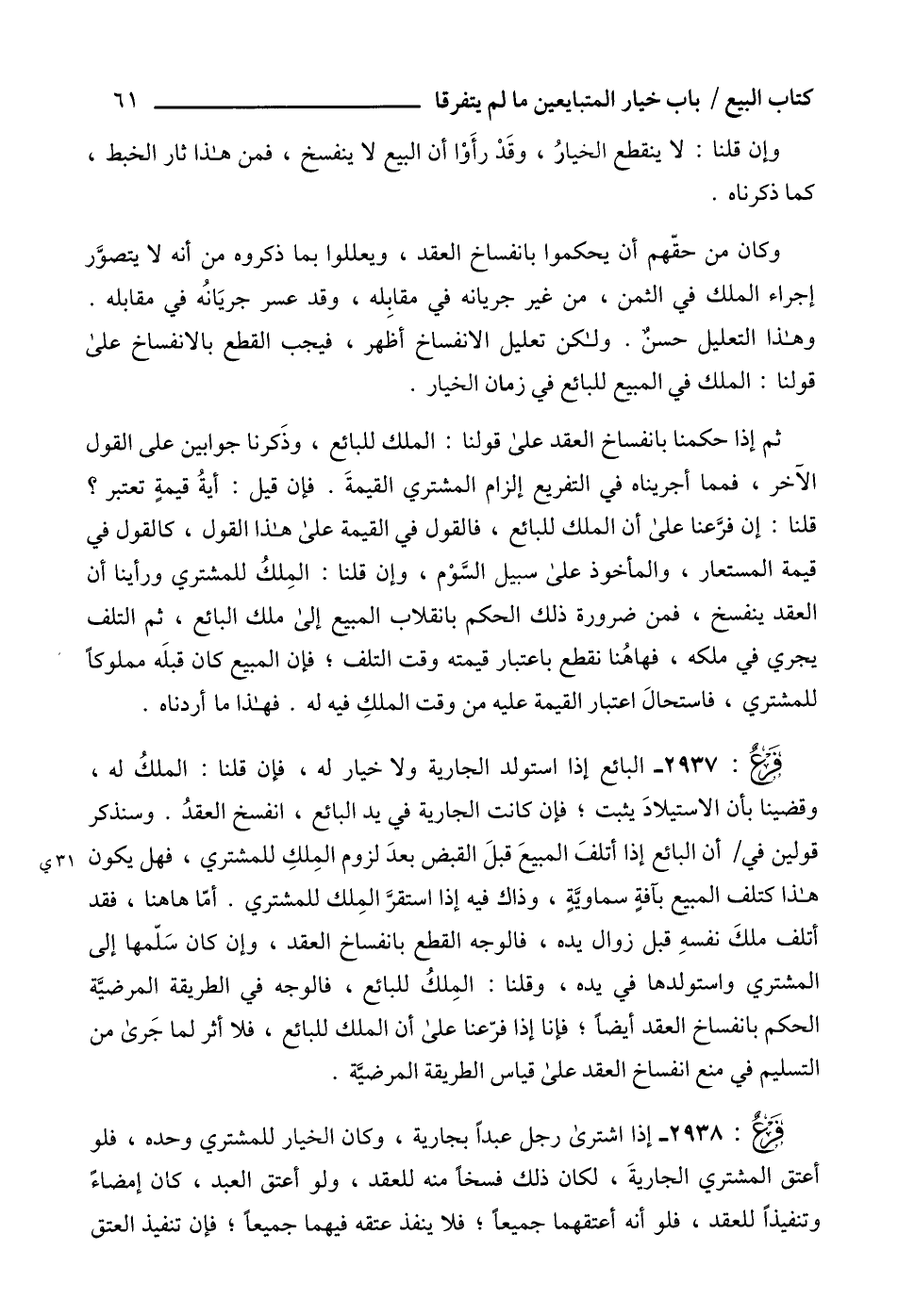 2937 - البائع إذا استولد الجارية ولا خيار له، فإن قلنا: الملكُ له، وقضينا بأن الاستيلادَ يثبت؛ فإن كانت الجارية في يد البائع، انفسخ العقدُ. وسنذكر قولين في أن البائع إذا أتلفَ المبيعَ قبلَ القبض بعدَ لزوم المِلكِ للمشتري، فهل يكون هذا كتلف المبيع بآفةٍ سماويَّةٍ، وذاك فيه إذا استقرَّ المِلك للمشتري. أمّا هاهنا، فقد أتلف ملكَ نفسهِ قبل زوال يده، فالوجه القطع بانفساخ العقد، وإن كان سَلّمها إلى المشتري واستولدها في يده، وقلنا: المِلكُ للبائع، فالوجه في الطريقة المرضيَّة الحكم بانفساخ العقد أيضاًً؛ فانا إذا فرّعنا على أن الملك للبائع، فلا أثر لما جَرى من التسليم في منع انفساخ العقد على قياس الطريقة المرضيَّة.