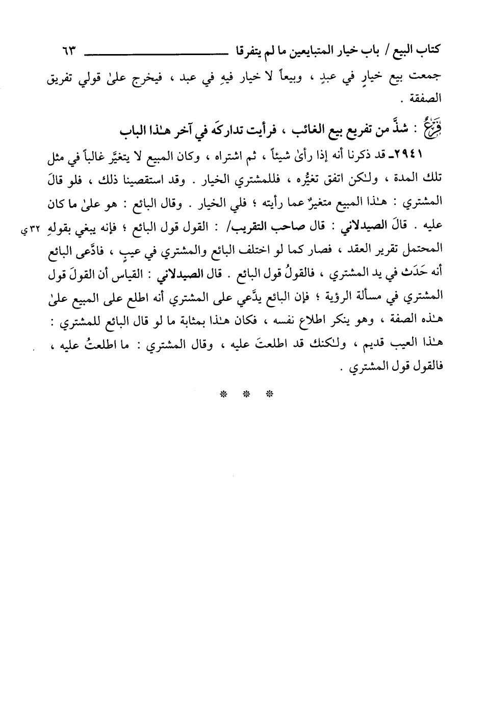 2941 - قد ذكرنا أنه إذا رأى شيئاً، ثم اشتراه، وكان المبيع لا يتغيَّر غالباً في مثل تلك المدة، ولكن اتفق تغيُّره، فللمشتري الخيار. وقد استقصينا ذلك، فلو قالَ المشتري: هذا المبيع متغيرٌ عما رأيته؛ فلي الخيار. وقال البائع: هو على ما كان عليه. قالَ الصيدلاني: قال صاحب التقربب: القول قول البائع؛ فإنه يبغي بقولهِ المحتمل تقرير العقد، فصار كما لو اختلف البائع والمشتري في عيبٍ، فادَّعى البائع أنه حَدَث في يد المشتري، فالقولُ قول البائع. قال الصيدلاني: القياس أن القولَ قول المشتري في مسألة الرؤية؛ فإن البائع يدَّعي على المشتري أنه اطلع على المبيع على هذه الصفة، وهو ينكر اطلاع نفسه، فكان هذا بمثابة ما لو قال البائع للمشتري: هذا العيب قديم، ولكنك قد اطلعتَ عليه، وقال المشتري: ما اطلعتُ عليه، فالقول قول المشتري.