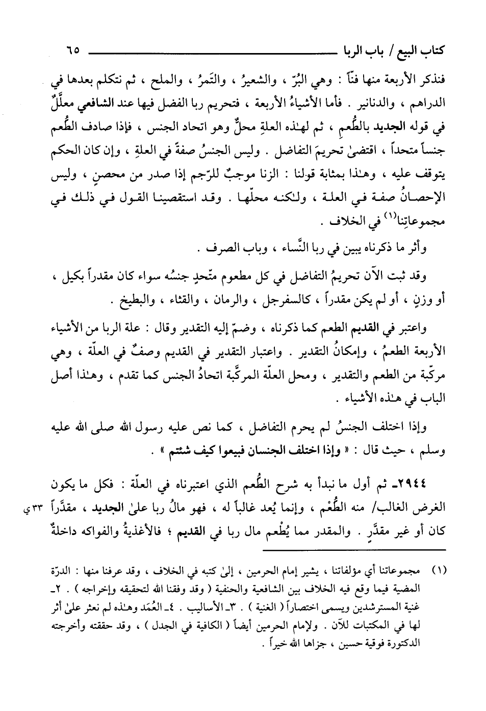 وقد ثبت الآن تحريمُ التفاضل في كل مطعوم متّحدٍ جنسُه سواء كان مقدراً بكيل، أو وزنٍ، أو لم يكن مقدراً، كالسفرجل، والرمان، والقثاء، والبطيخ.